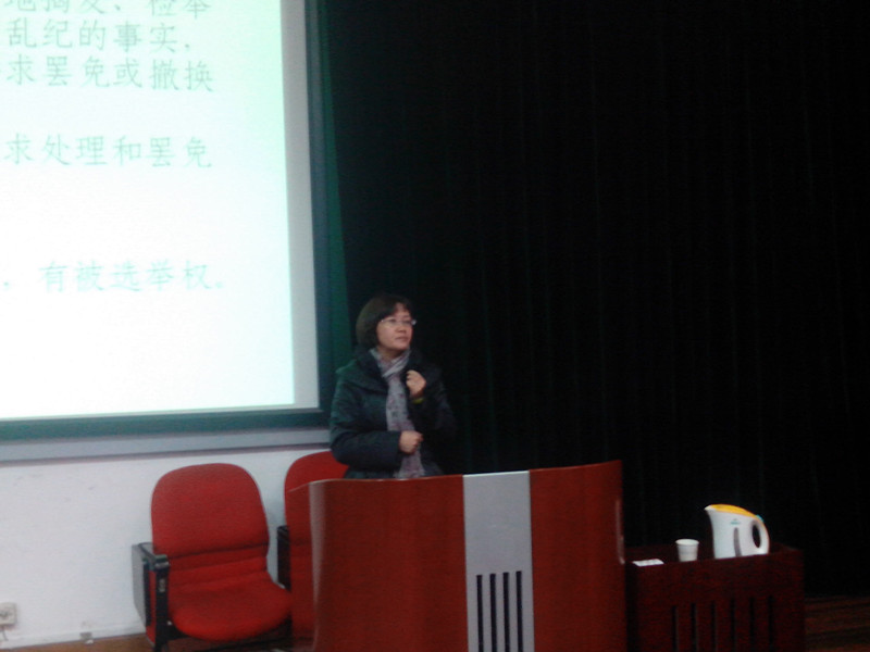 刘淑慧老师先详细讲解了党员的八项义务和八项权利。讲解每一条义务和权利的过程中,刘老师不断用她从事教育工作几十年来遇到的实例来丰富其演讲内容,让入党积极分子们对每一条权利义务都理解透彻。其中,刘老师还对八项义务进行了归纳,把第一项义务作为所有义务的前提,第二、三项义务概括为政治方面的要求,四、五项总结为组织方面的要求,六、七、八项则为衡量党员的基本标准,这种归纳方便了入党积极分子对于党员权利和义务的掌握。
