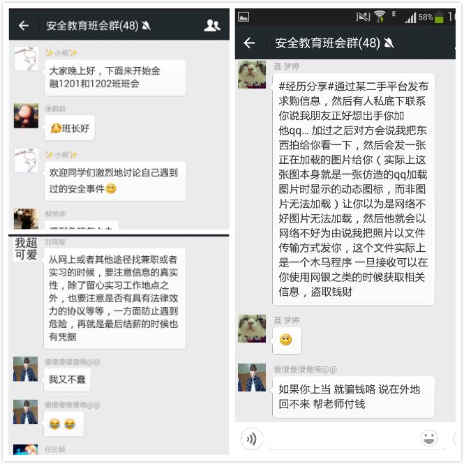 2015年5月17日晚,为切实加强同学们的自我安全保护意识,金融1201和金融1202班紧紧围绕“校园安全教育”这一主题,在寝室间交流分享身边安全隐患及案例的基础上,我们在班群里同样展开了热烈讨论。同学们踊跃发言,讲述了自己的亲身经历和听说过的相关事件,引起了大家的共鸣。同学们提出的案例主要涉及了寝室防盗、夜归防狼、网络诈骗、短信和电话诈骗、地铁站和商场诈骗、实习诈骗等,并提出了相应的应对措施。