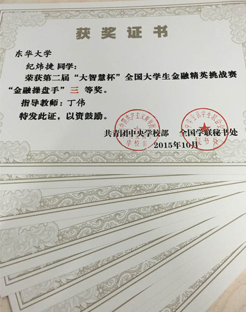 近日,从共青团中央学校部传来喜讯,成人网址 纪炜捷等13人(包括本科生、研究生)荣获第二届“大智慧杯”全国大学生金融精英挑战赛“金融操盘手”三等奖。
