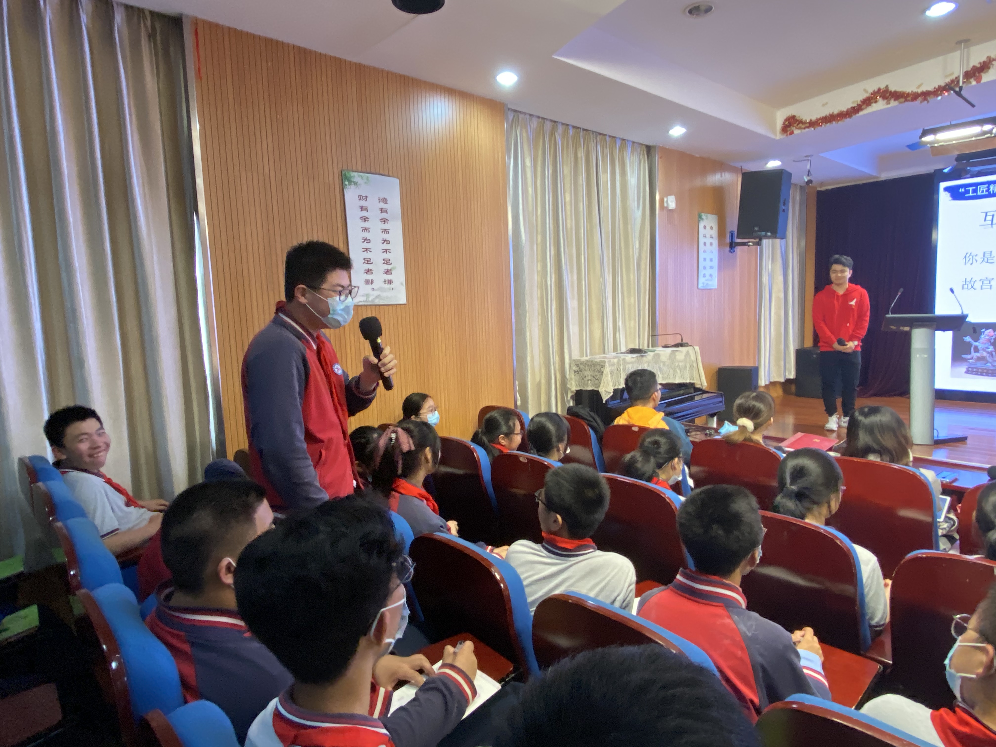5月11日,宣讲团走进新泾中学,深入长宁区中小学思政课场域,以理论阐释、故事分享、互动提问的鲜活形式,围绕何为工匠精神、工匠精神故事分享、如何践行工匠精神三个篇章展开讲述。宣讲团成员乔薇、翁子阳围绕图片、文字、视频、口述“四位一体”,全面阐述工匠精神的内核,使思政课入耳入脑又入心。无论是《我在故宫修文物》纪录片中展现的故宫文物修复师王有亮高昂的劳动热情,还是中国摩天大楼第一人陆建新争创一流、艰苦奋斗的劳模精神,宣讲团结合“理论大背景”和“个人小事迹”,由大及小、深入浅出地呈现工匠精神的时代价值,引导在场青少年坚定理想信念、崇尚劳动、敬业守信、精益求精。