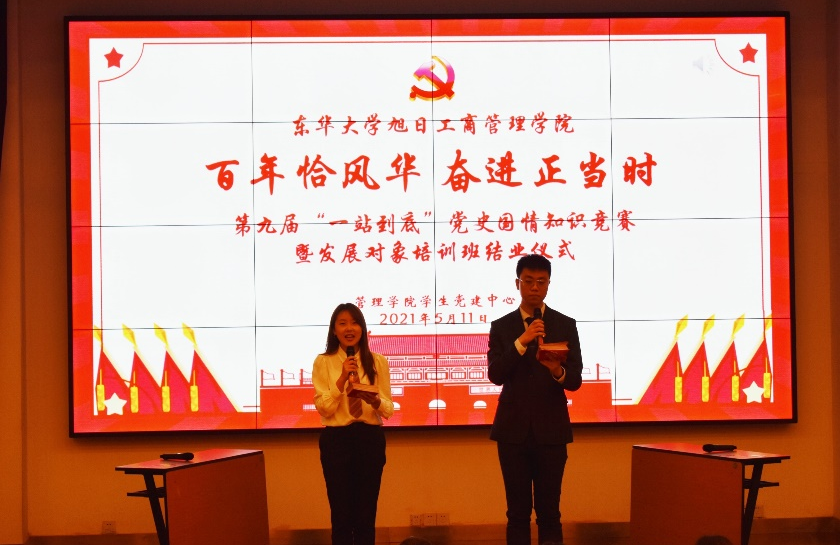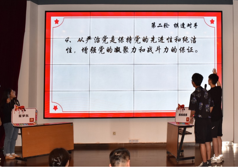 知识竞赛历经为期1月党校和各支部预选及易班为期1周“党史国情知识问答”,推选11支队伍进入线下环节。现场分为“分秒必争”、“棋逢对手”及“百分挑战”三轮,经过激烈比拼,最终工商系学生党支部以96分优异成绩取得胜利,夺得“战神”称号,管理202硕党支部获“最佳表现奖”。