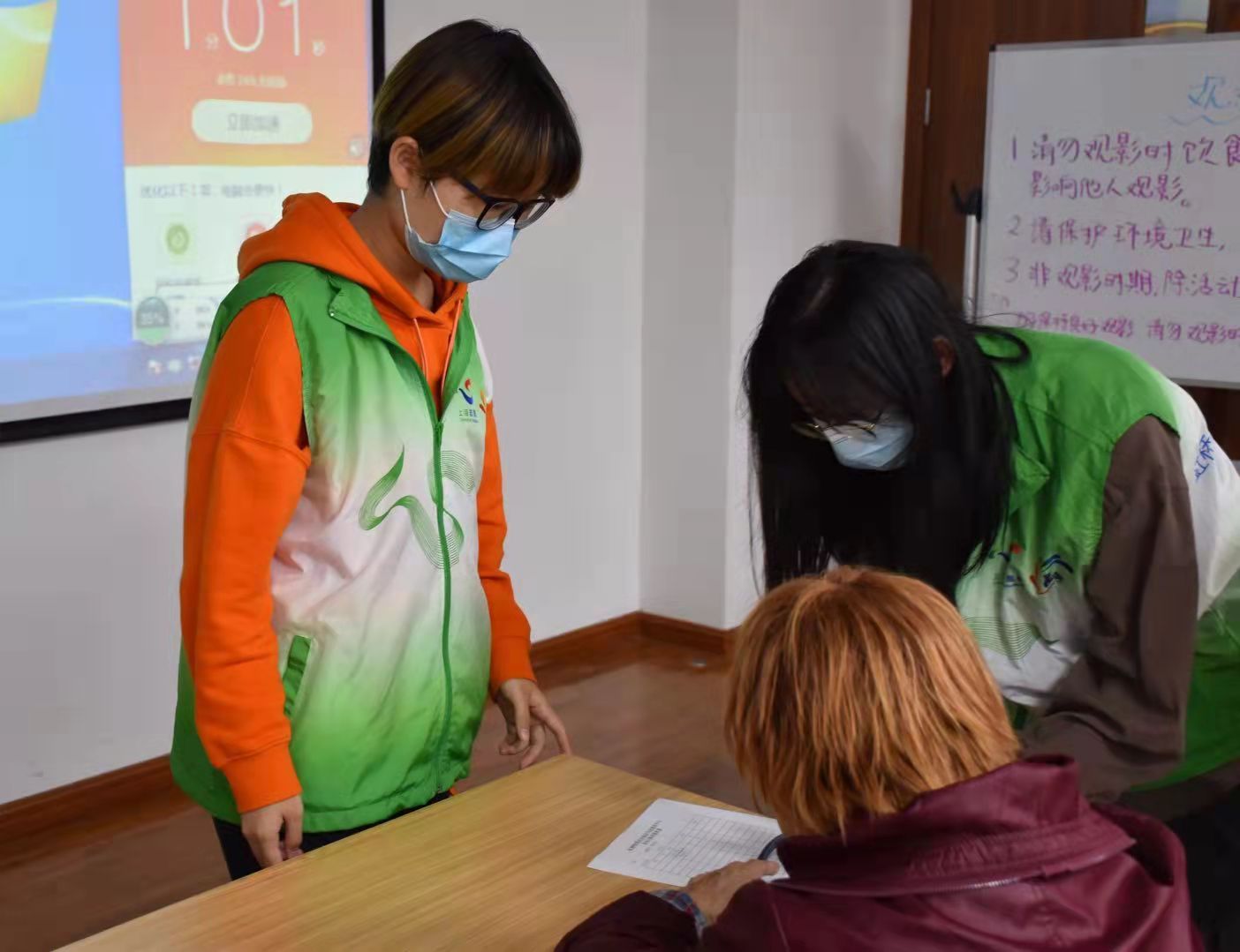 下午1:50,志愿者到达虹桥敬老院集合,工作人员向其分发志愿者马甲并强调教授时的注意事项。随后,志愿者进入友乐微课堂,安排老人们签到及就坐,并于2点整正式开始志愿活动。