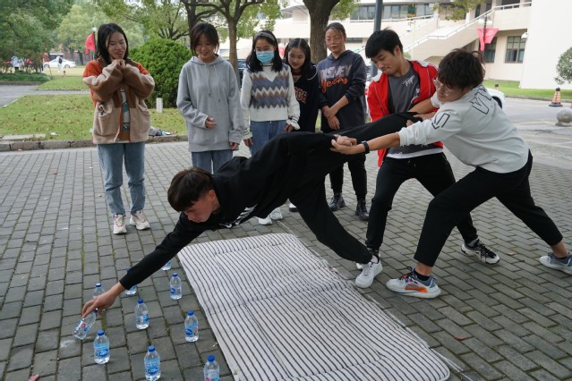 随后,阳光队员被带领至室外进行素质拓展活动。在篮球场旁分组进行拔河大游戏比拼后,各组按照抽签顺序前往分布于校园各处的六个打卡点进行小游戏:坐地起身、翻叶子、套圈、风火轮、跳大绳和捡杯子。打卡限时一小时,按游戏成绩总积分排名第一、二组获得奖励,第五、六组接受惩罚。游戏过程中,阳光队员积极参与,团结协作,公平竞争,留下了有趣的回忆。