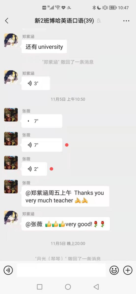 活动过程中,老年学生根据讲义发送朗读语音,志愿者们对老年学生实际的朗读情况与先前了解到的水平进行对比分析,并在群中通过语音的方式一对一指导,老年学生再根据志愿者们的指导纠正重新练习,在群中发送更标准的朗读语音。