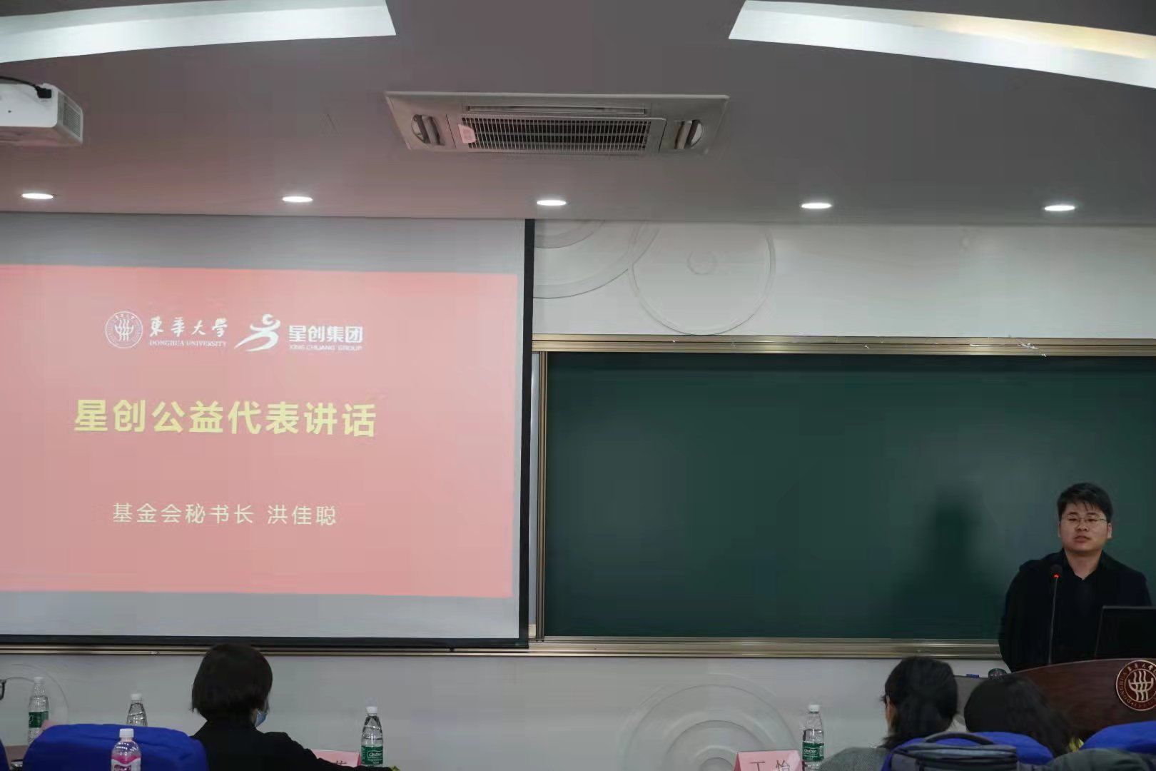 最后,星创公益代表洪佳聪发言,对获奖同学表示祝贺,对志愿者的努力给予肯定,对同学们实践“崇德博学,砺志尚实”的校训表示赞扬并勉励所有获奖受助同学以及在场学生在今后的学习生活中继续努力,再接再厉,争取更加优异的成绩。