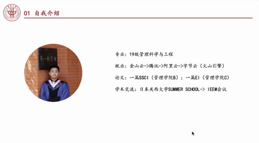 谢疏影毕业后任职于海通恒信管培生,从科研、考证和实习求职三方面进行分享。谢疏影强调主观能动性的重要性,同学们在科研时需要多和导师交流,不能等待导师下发任务,在实习时,也应当做好向上管理,每日复盘。
