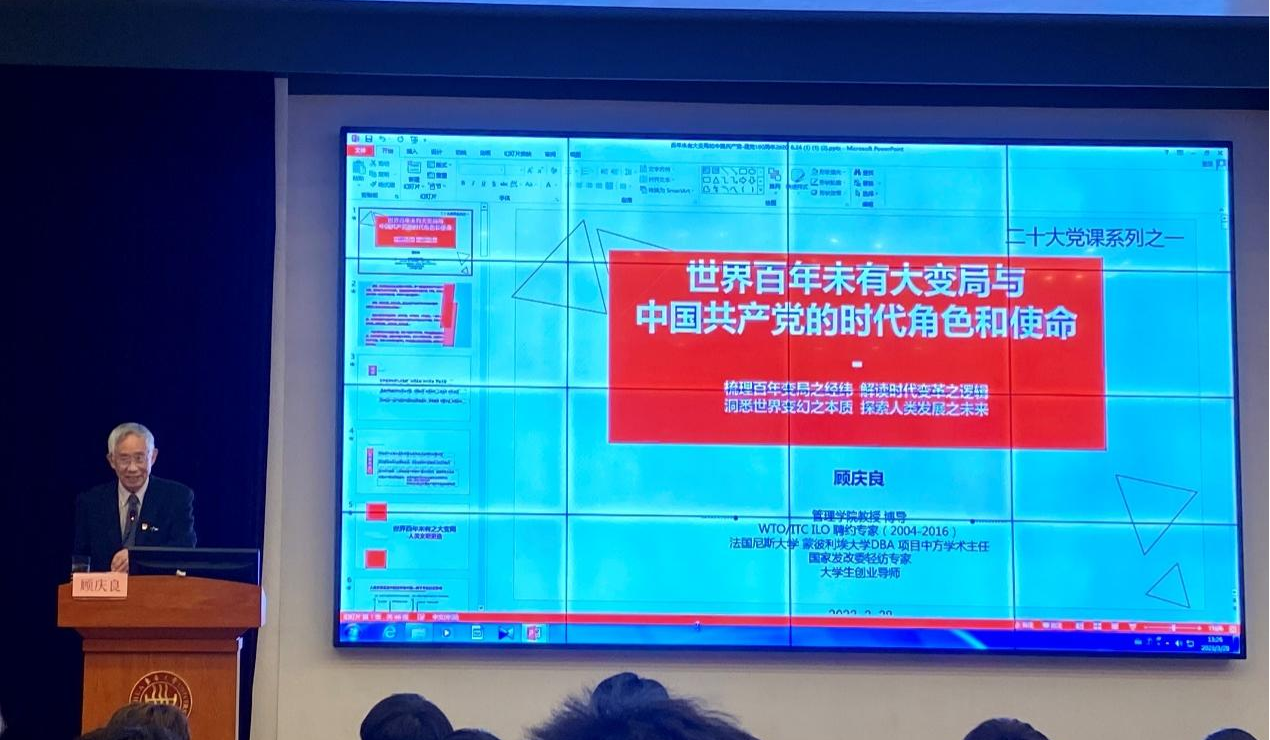 开班式后,学员们以热烈的掌声欢迎顾庆良教授为大家带来“世界百年未有大变局与中国共产党的时代角色和使命——学习宣传贯彻党的二十大精神”主题党课。顾老师结合自身专业背景、生活实例,深入浅出为学员们梳理国内外百年之变局,解读时间变革之逻辑,洞悉世界变化之本质,分析日前中国和世界之局势,让大家更加清晰地了解了中国共产党的时代职责和历史使命。