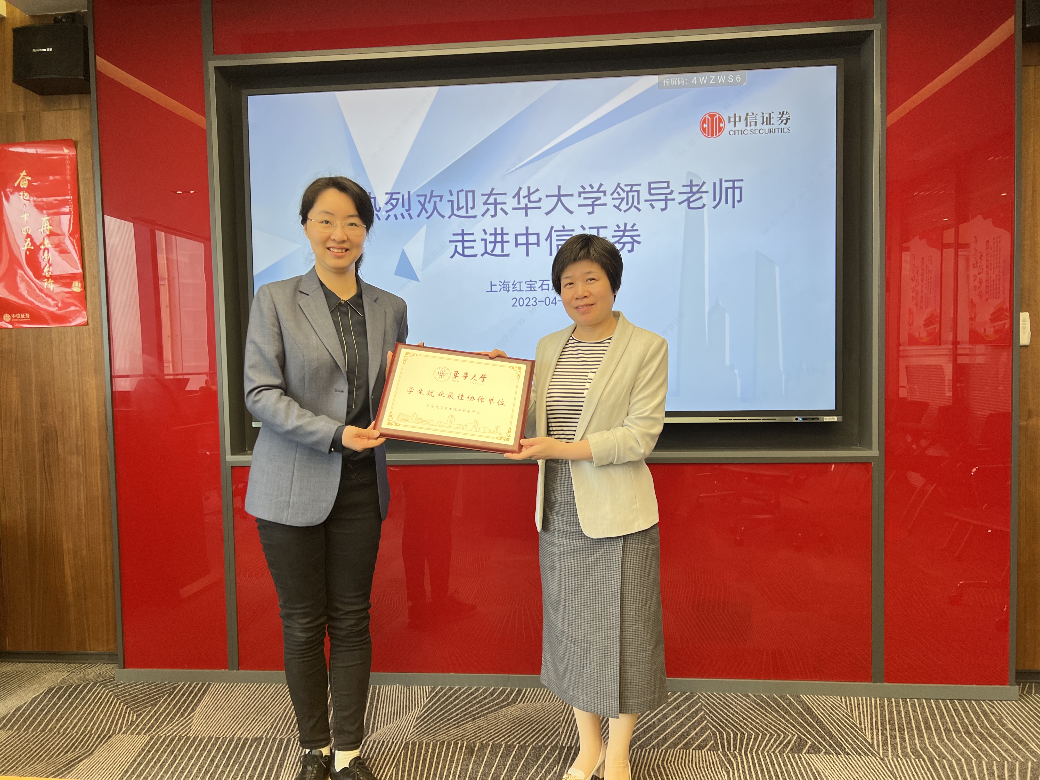 丁怡代表学院向中信证券颁发成人网址 学生就业最佳协作单位铭牌。