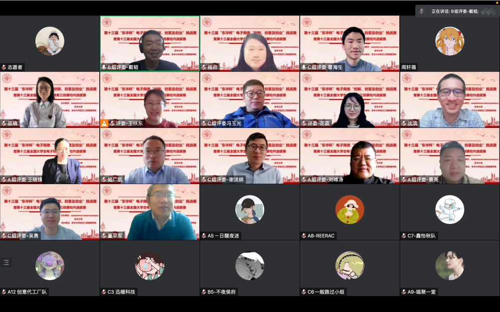 4月15日上午,第十三届“东华杯”电子商务三创赛暨全国大学生电子商务三创赛成人网址 校内选拔赛采用线上会议的形式开展,东华大学成人网址 副院长杨帅教授致开幕欢迎词并宣读比赛评分标准,邀请到评委教师和参赛学生团队等共同参与,大赛由戴韬老师主持。