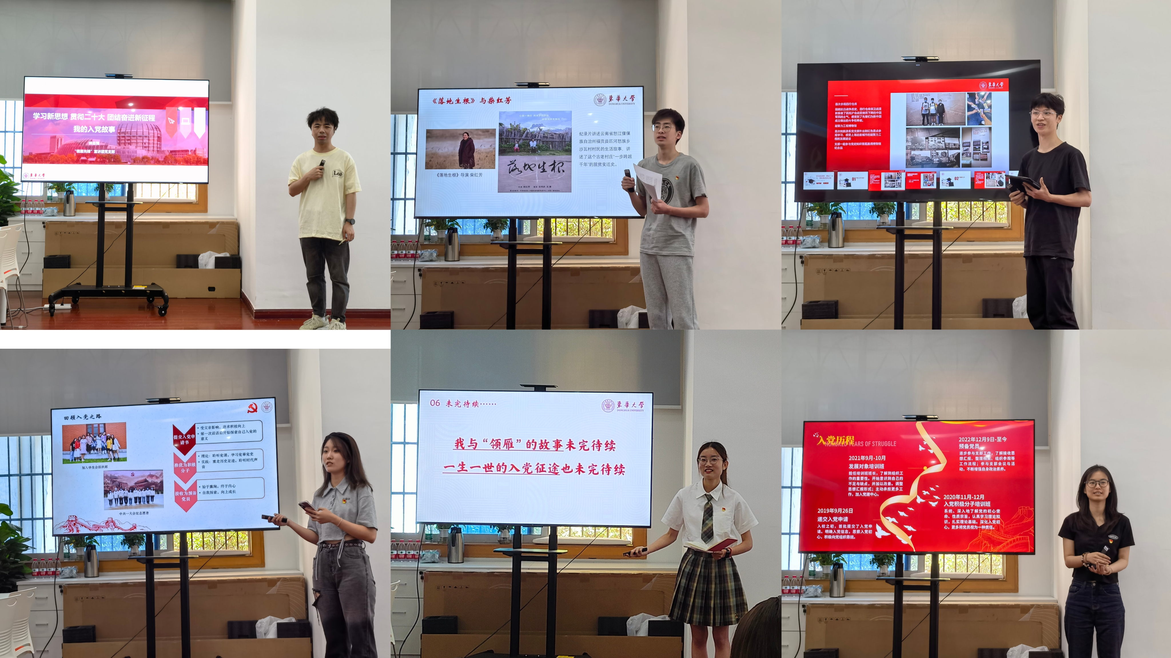 紧接着,六位毕业生党员以“入党前后的我”为主题,声情并茂地分享了自己入党的心路历程以及对过去、当下与未来的思考。其中,龙世华同学回顾了自己入党前后参观四行仓库、中共一大纪念馆等探索红色足迹的经历,以及投身于上海电影博物馆、疫情防控等为人民服务的志愿服务故事;并结合自身儿时、以及在参观学习时了解到的乡村学校曾经的落后情况,表达了对乡村振兴事业蓬勃发展的敬仰以及未来自身即将加入这份事业的憧憬。赵政同学将自己的入党心路历程划分为了三个阶段,展现了入党动机受家庭、与老师间的谈话、自我与党校的学习过程,以及为社会做出贡献的实践工作的影响而不断深化、更为坚定地选择共产主义的过程;她认为,入党并成为“领雁先锋”宣讲团党支部的一员不仅让她获得了归属感,更是提升了自我的政治素养和工作习惯,即使即将因为毕业而与熟悉的校园与伙伴道别,但热忱的、追求向上的心将汇集大家在更好的未来相见。