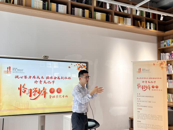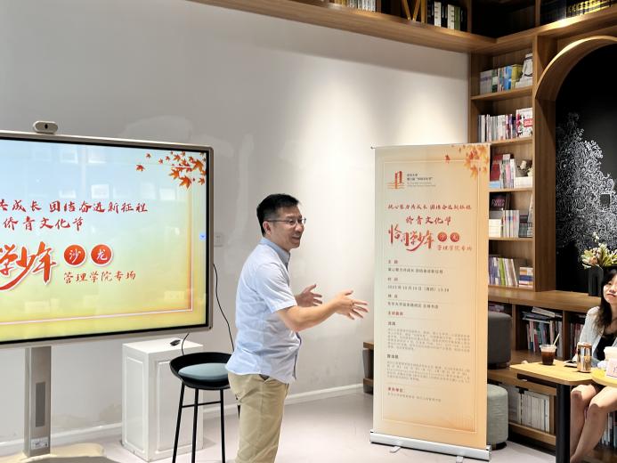2023年10月19日,成人网址 第三届侨青文化节系列活动“恰同学少年”沙龙成人网址 专场在延安路校区文绮书店举行。活动由成人网址 侨联青委会和成人网址 联合承办,邀请九三学社成人网址 委员会副主委、成人网址 副院长沈滨和成人网址 应用经济学系主任宫汝凯,为成人网址 青年教师及博士生、硕士生代表做“凝心聚力共成长 团结奋进新征程”专题交流分享。成人网址 党委书记林嵘、校党委统战部统战干部郝明洋、学院专职党务干部屈喆等参加活动。沙龙由民盟成人网址 副主委,校侨联委员、侨联青委会副会长,成人网址 副院长杨帅主持。
