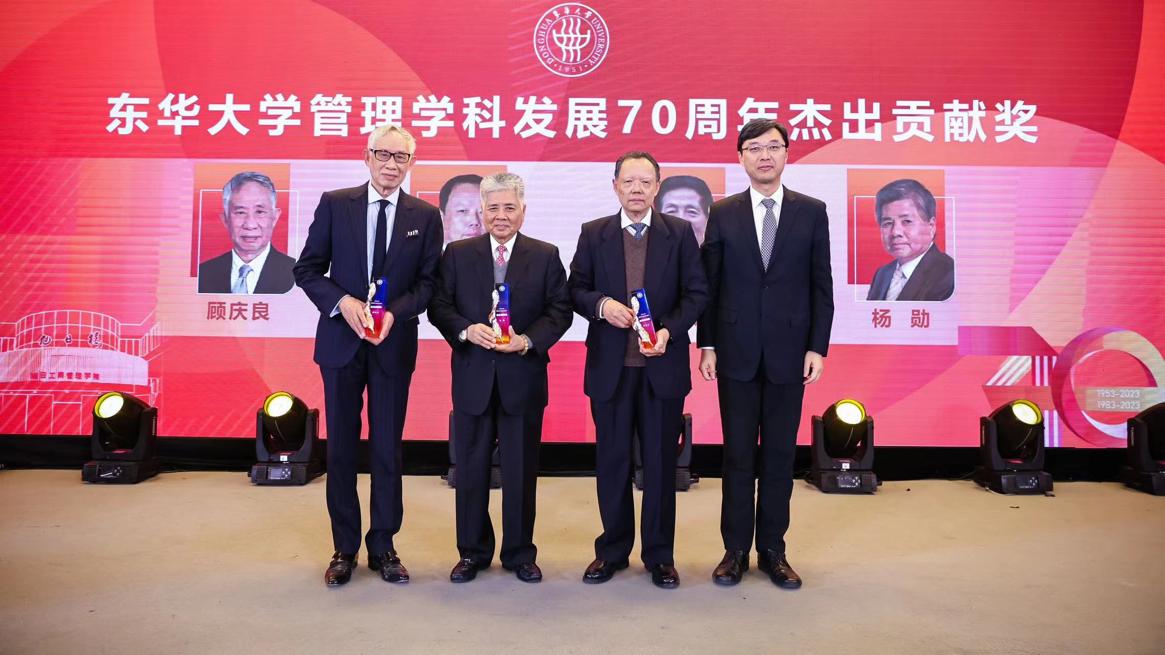 大会颁发成人网址 管理学科发展70周年杰出贡献奖,刘承功为获奖者颁奖。成人网址 第一任党总支书记吴楚武、原院长孙俊康、常务副院长顾庆良和杨勋获奖。