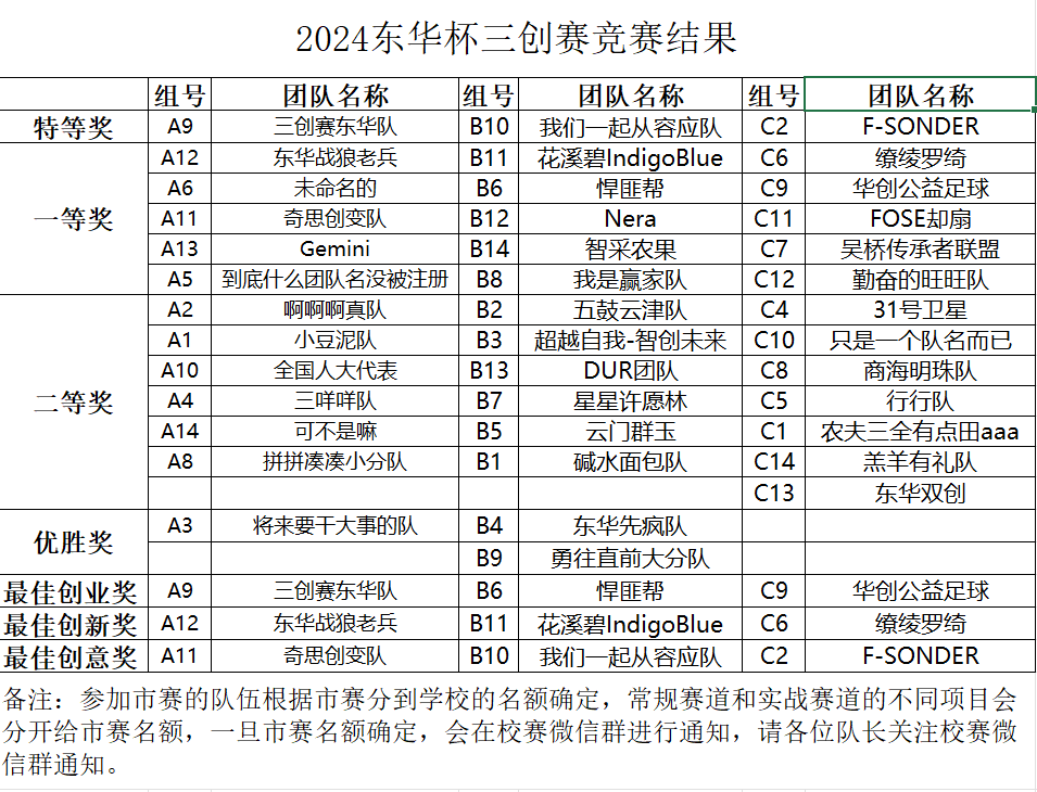 最终,“三创赛东华队”、“我们一起从容应队”和“F-SONDER”团队斩获特等奖,本次比赛共评出一等奖15名,二等奖19名,优胜奖若干,另外还有“东华战狼老兵”、“华创公益足球”、“悍匪帮”等队伍获得了单项奖的荣誉。获奖名单如下: