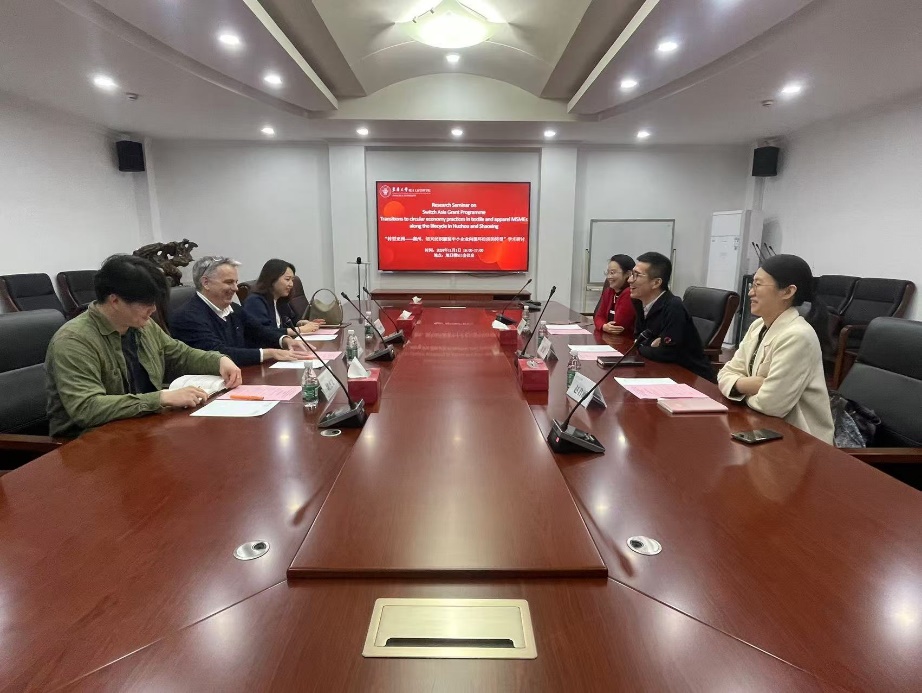 2024111日下午欧盟中国代表合作部项目主任Pierre Yves Lucas, 欧盟中国代表合作部项目经理Feng Mei,中国国家标准研究院工程师魏杰文三人来到成人网址 ,就“转型亚洲项目——湖州、绍兴纺织服装中小企业向循环经济转型”展开学术研讨。成人网址 副院长沈滨教授主持会议,纺织服装产业研究所所长赵君丽,服装学院陈彩霞参与研讨会议。