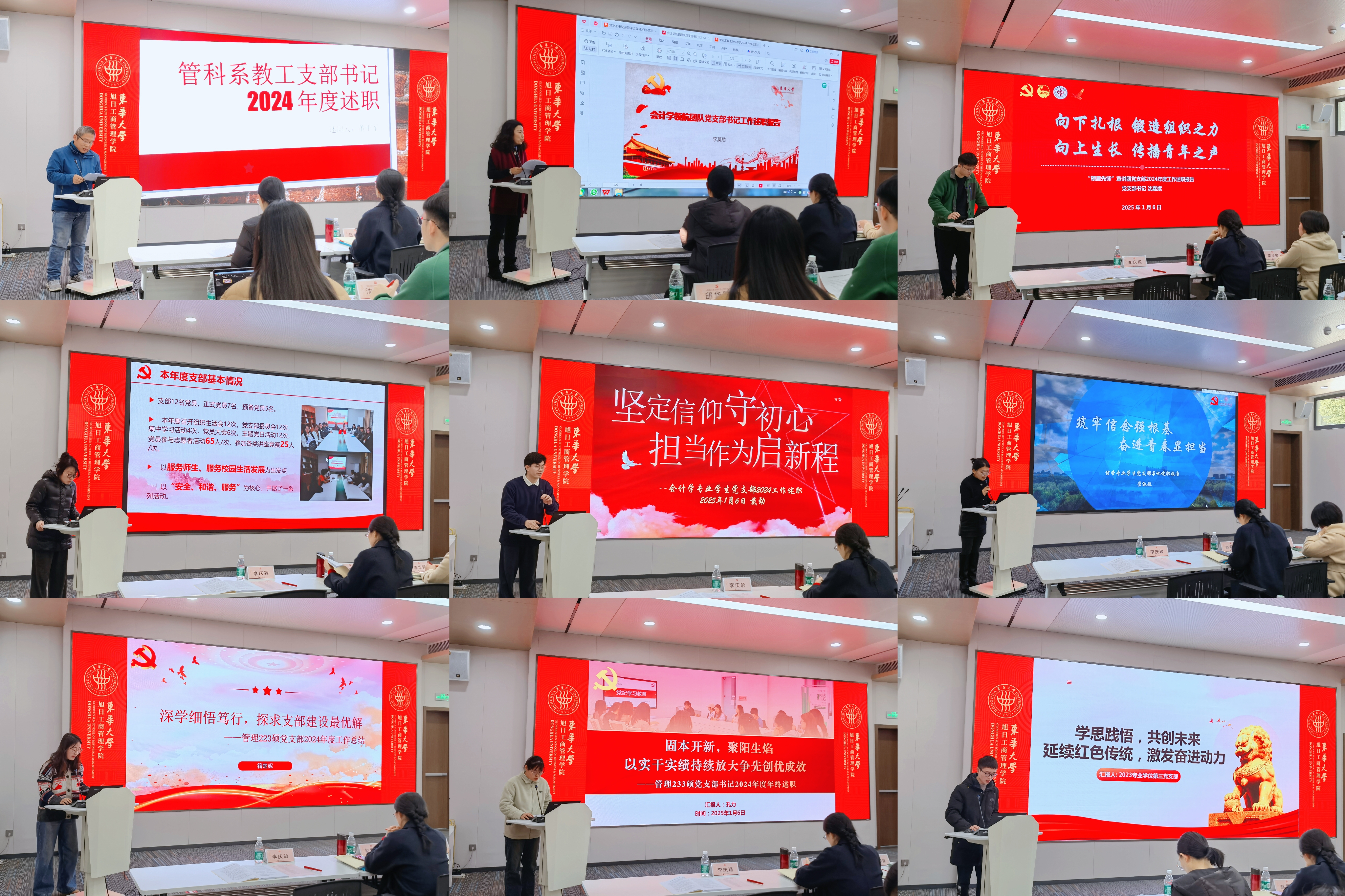 会上,九位任期满一年的党支部书记进行现场述职。管理科学与工程系党支部董平军、会计学领航团队党支部李莫愁、“领雁先锋”宣讲团党支部沈嘉斌、红“寓”领航党支部徐欣怡、会计学专业学生党支部戴劲、信管专业学生党支部崔淑敏、管理223硕党支部籍楚妮、管理233硕党支部孔力、2023级专业学位第三党支部徐皓聪紧密围绕述职重点,聚焦贯彻党支部工作条例、党员教育管理工作条例精神,围绕党支部学习教育活动开展、党员教育培养管理等方面进行工作述职,分析查摆问题,明确进一步改进思路和举措。