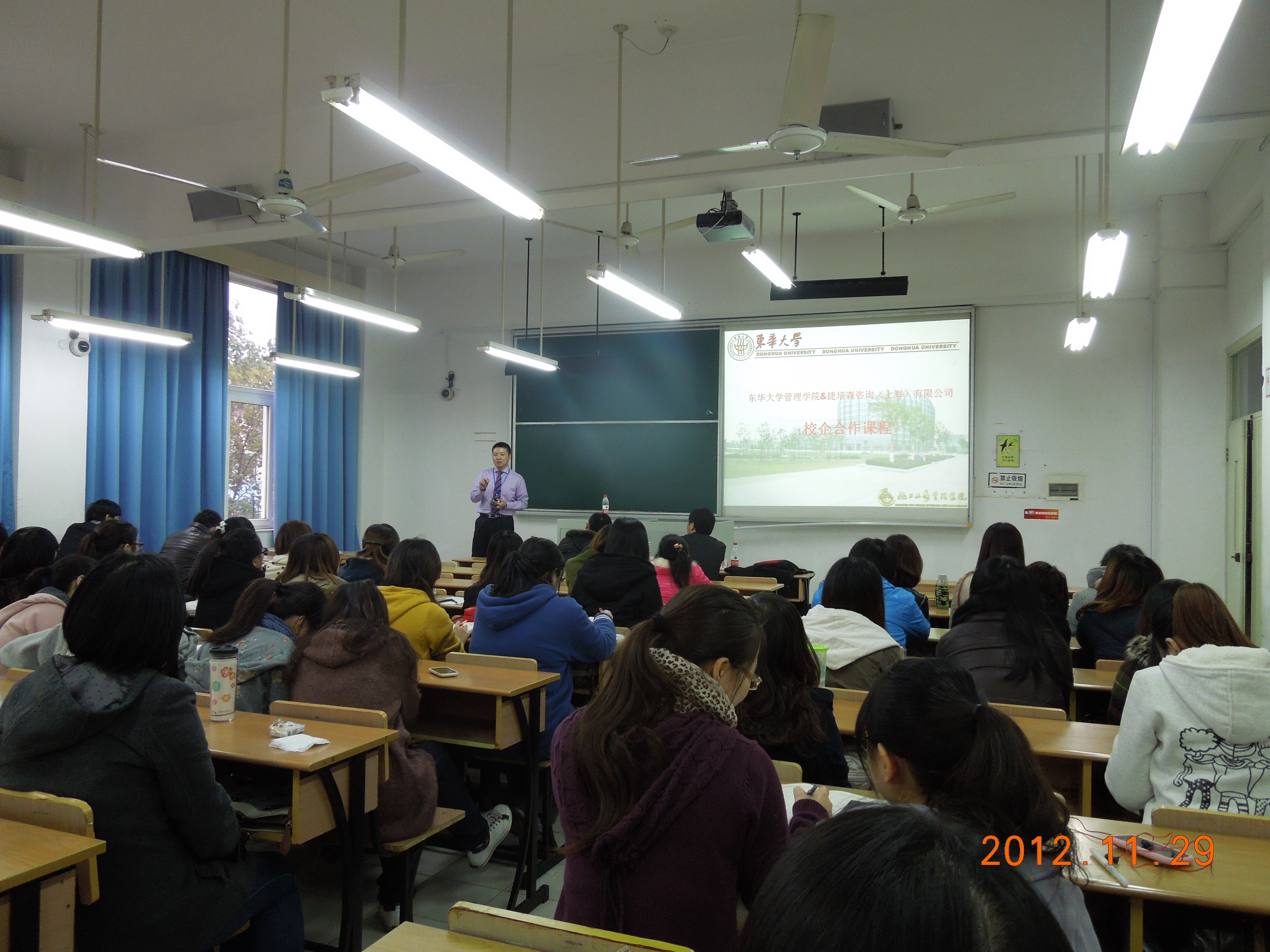 接下来,蔡经理以一段3分多钟的视频作为导入为我们介绍了捷培森公司的相关背景以及公司的相关项目,其中以“超高层建筑”为例为我们阐述了捷培森咨询有限公司组织举办高峰论坛的相关内容,并从捷培森高峰论坛的举办的前期准备、中期进行以及后期整理的全过程为我们介绍了捷培森公司各个重要部门的工作状况。在演讲的过程中,蔡总以亲身经验以及所见所闻,用真实、生动的例子向我们展示了职场生活中的经验教训,也对我们作出了“抓紧时间、充实自己、增强就业竞争意识”的建议。最后,蔡总也留了提问时间,与同学们交流互动,认真地为同学们解答专业以及职业生涯规划方面的问题,也为相关同学提出了自己的建议,使在场的同学获益匪浅。课程结束时,蔡总很热情也很周全地给同学们留下了联系方式,并表示欢迎同学进行相关咨询,蔡总也表示今后将尽可能安排更多的机会与同学们交流。