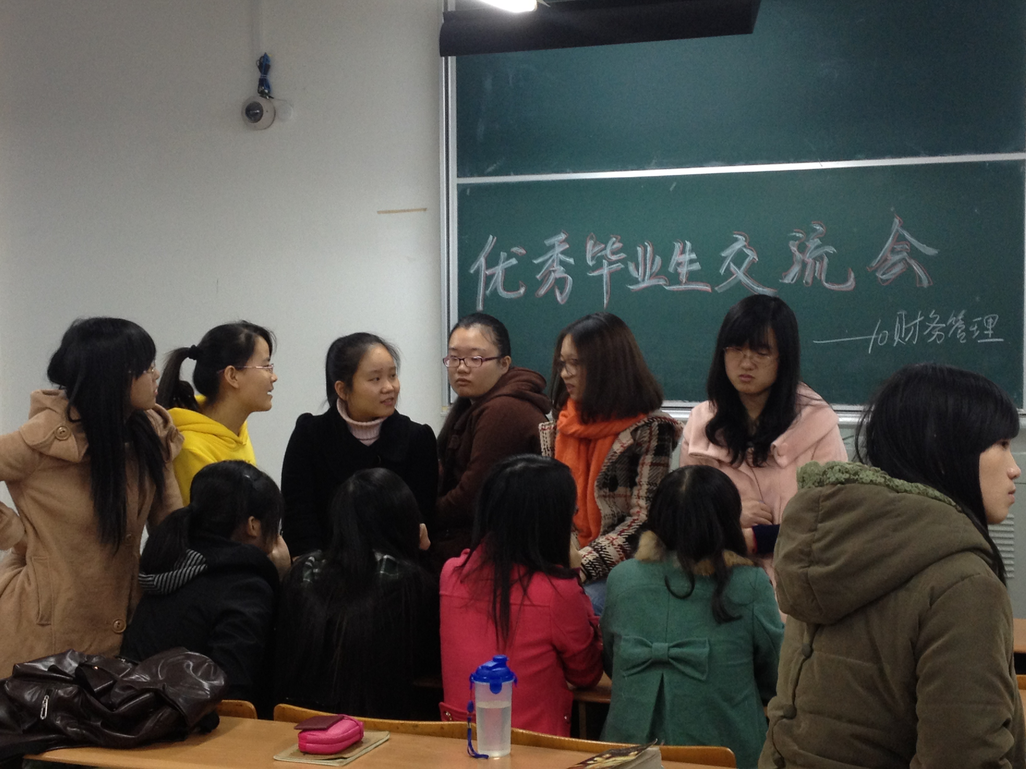 然后发言的是陈亮学长。学长给出了这样的建议:(1)公务员的复习应从日常生活开始,在校期间尽量向党组织靠拢,或者多担任学生工作,这样在面试时能有优势;(2)对想进国企的同学,六级成绩很重要;对想进外企的同学,优秀的口语水平能让你在面试时脱颖而出;(3)学好office软件,尤其是powerpoint、excel等;(4)多看一些咨询公司的面经;(5)实习时尽量找一些名气大的公司。 最后是王欣学姐和郭頠学姐。对于考研,学姐强调考研不要考不如本校的学校。HR筛选简历时都是只看第一学历,如果研究生院校不是非常有竞争力,那么找工作时很吃亏。同时 ,研究生阶段要努力提升个人的学术水平和实践能力,积极参加课外科技活动,不断充实自己,为毕业后正式步入社会做好准备。 11月29日晚在4教303,10级财务专业的同学成功举办了主题为“优秀毕业生的经验分享”的讲座。讲座邀请到了沈洁老师(07级会计专业,直升研究生,现兼职辅导员。)赵亮学长(08级会计专业,现于全球五百强之一的飞利浦工作),李扬学长(08级会计,现于四大之一的安永华明会计师事务所工作),刘晓梅学姐(07级会计专业,考研到东华技术经济及管理专业)以及孙慰楠学长(08级财务管理专业,现于中国工商银行工作)为同学们分享他们的考研、直研经历,工作心得和人生体会。开始是每一位毕业生走上讲台为同学们分享他们当初在学校的经历,主要由以下几点:1、大三是大学关键的一年,每个人应该把握好自己的时间,明确自己毕业后的目标,然后为自己的目标努力奋斗;2、毕业后准备工作的同学,应该抓紧时间找一个好的实习单位实习,为自己毕业找工作奠定基础;3、相对在学校读书来说,其实工作压力还是很大的,学长学姐再次告诫我们要珍惜在学校的学习时间。