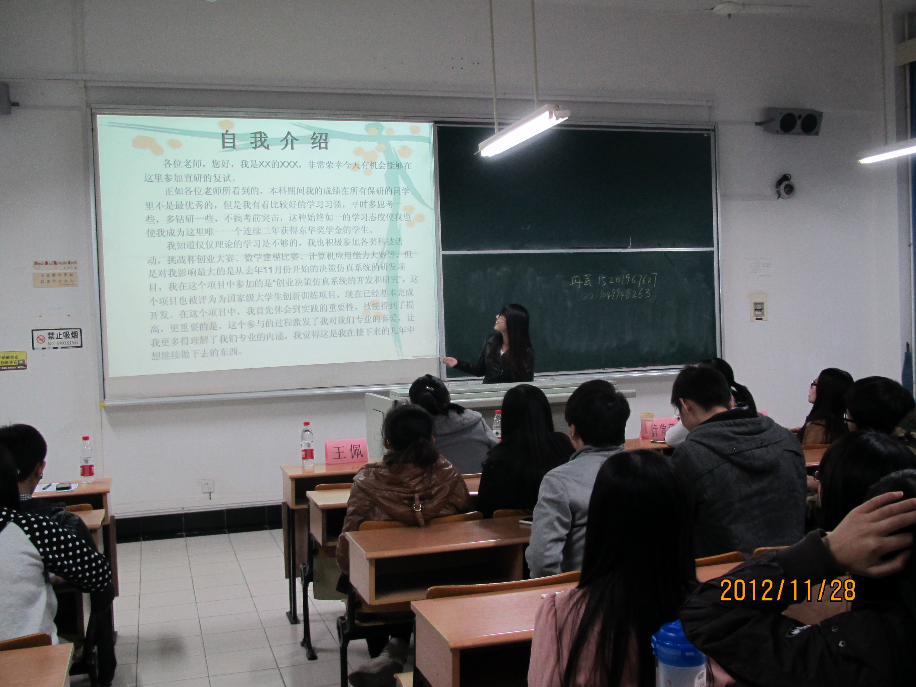 首先,周妙苗学姐从整体上为同学们介绍了与关物流专业有关的各项竞赛情况,包括物流设计大赛,全国大学生挑战杯,全国大学生英语竞赛,全国大学生数模竞赛,全国大学生电子商务三创赛等,并在时间安排上给大家提出了相应建议。然后,苒芸学姐针对全国大学生数模竞赛为同学们展开的详细的介绍,并着重在前期准备、团队成员交流、竞赛相关注意事项等方面分享了自身经验。作为物流10级的直系学姐,苒芸同学还和大家分享了自己从大三开始的保研路程,对同学们的触动颇深。 针对大学生创新创业活动,曾参加过挑战杯大学生创业比赛、创业实践项目等多项创业比赛,并已注册成立公司的王娅冬学姐向大家娓娓道来自己与创业的故事。对于创业,王娅冬学姐认为并不是每个人都适合的,创业需要的是一份持之以恒的激情和坚持,并在最后引用乔布斯在斯坦福大学毕业典礼上的一段话来勉励大家——Stay Foolish,Stay Hungry。 大学生创业毕竟是少数,就业往往是大多数毕业生的选择。在企业人力资源部门进行实习,深谙HR心理管莺莺学姐为大家带来了关于求职、实习的经验分享。管莺莺学姐以求职的四个要素:动机、薪水、地点、离职理由为开始,从简历、面试、实习等方面与大家分享了自己的实习体会,并在实习单位的筛选和时间的安排方面提出了中肯的建议。 针对同学关心的考研和保研问题,保送成人网址 管理科学与工程研究生的王佩学姐为同学们整理了详细关于保研和考研的相关资料,针对跨校考研,跨专业考研等问题给大家提出了自己的建议。 最后,黄洪涛老师总结这次交流会,希望同学们能从现在开始确定方向,提早准备,为大四打好基础。交流会在同学们热烈的掌声中结束,这样一场交流会,对于不少处在迷茫期的大三学生来说就像是一场及时雨,让同学们对于自己面前的道路有了更多的了解,能够及时自我定位,选择适合自己的道路并为之努力。 |