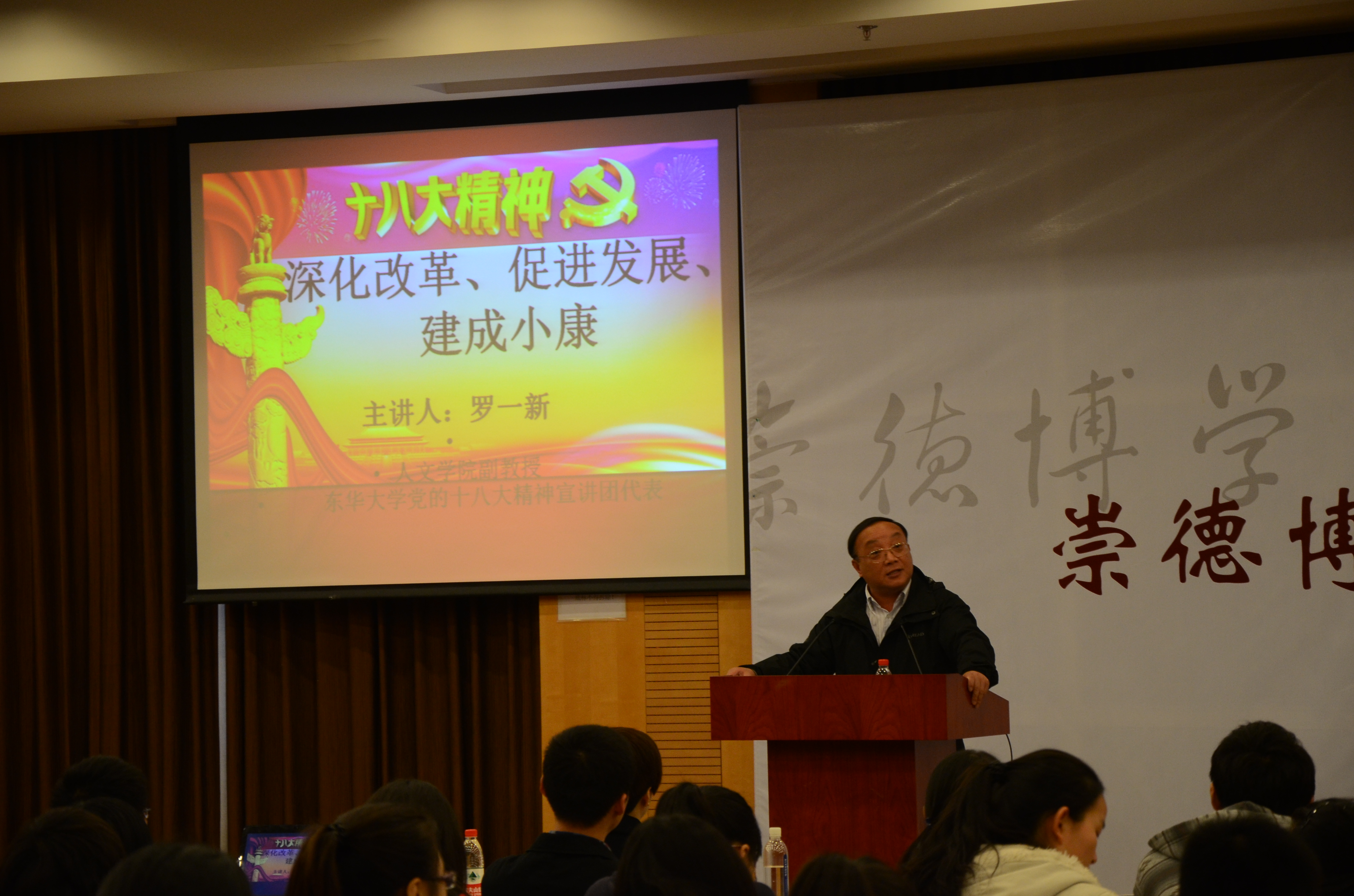 2013年3月19日下午13:30,成人网址 成人网址 于延安路校区三主四楼报告厅举行了学习党的十八大精神学习讲座,本次讲座担任主讲的是人文学院副教授、成人网址 党的十八大精神宣讲团代表罗一新老师,本次讲座受到了成人网址 全体党员的热烈欢迎。出席本次讲座的老师有成人网址 党总支副书记于光老师、学生工作办公室副主任江娥老师、专职辅导员魏冰老师等。