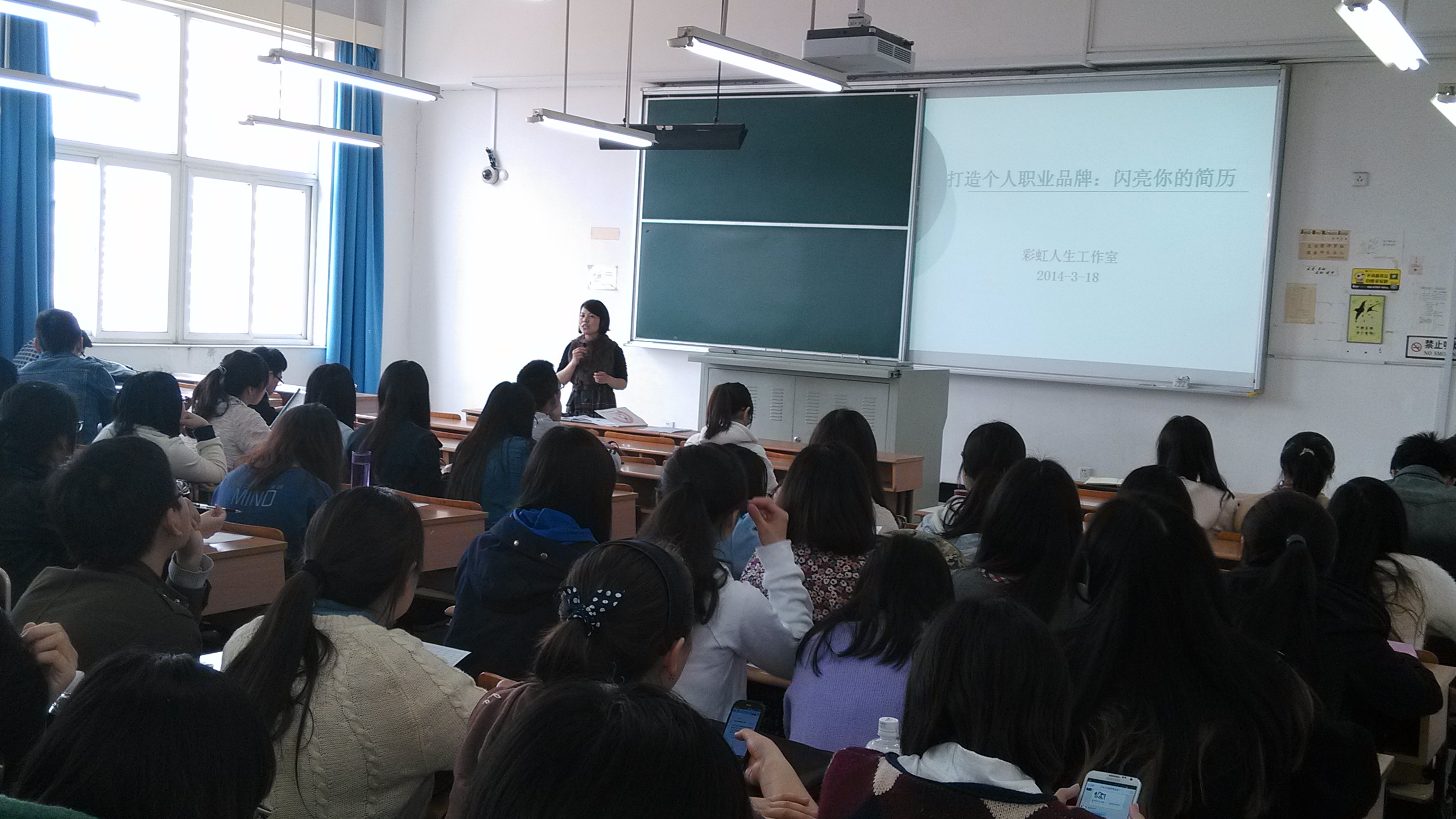 2014年3月18日13点30彩虹人生工作室负责人王丽华老师在我校四教501教室召开了闪亮简历的专题讲座,对象为成人网址 工商大类2011级全体本科生。讲座的内容包括简历前的准备工作、简历要素和类型、中文简历的制作和简历的投递四个模块,旨在帮助应届大学毕业生优化个人简历,增加求职的成功率。
