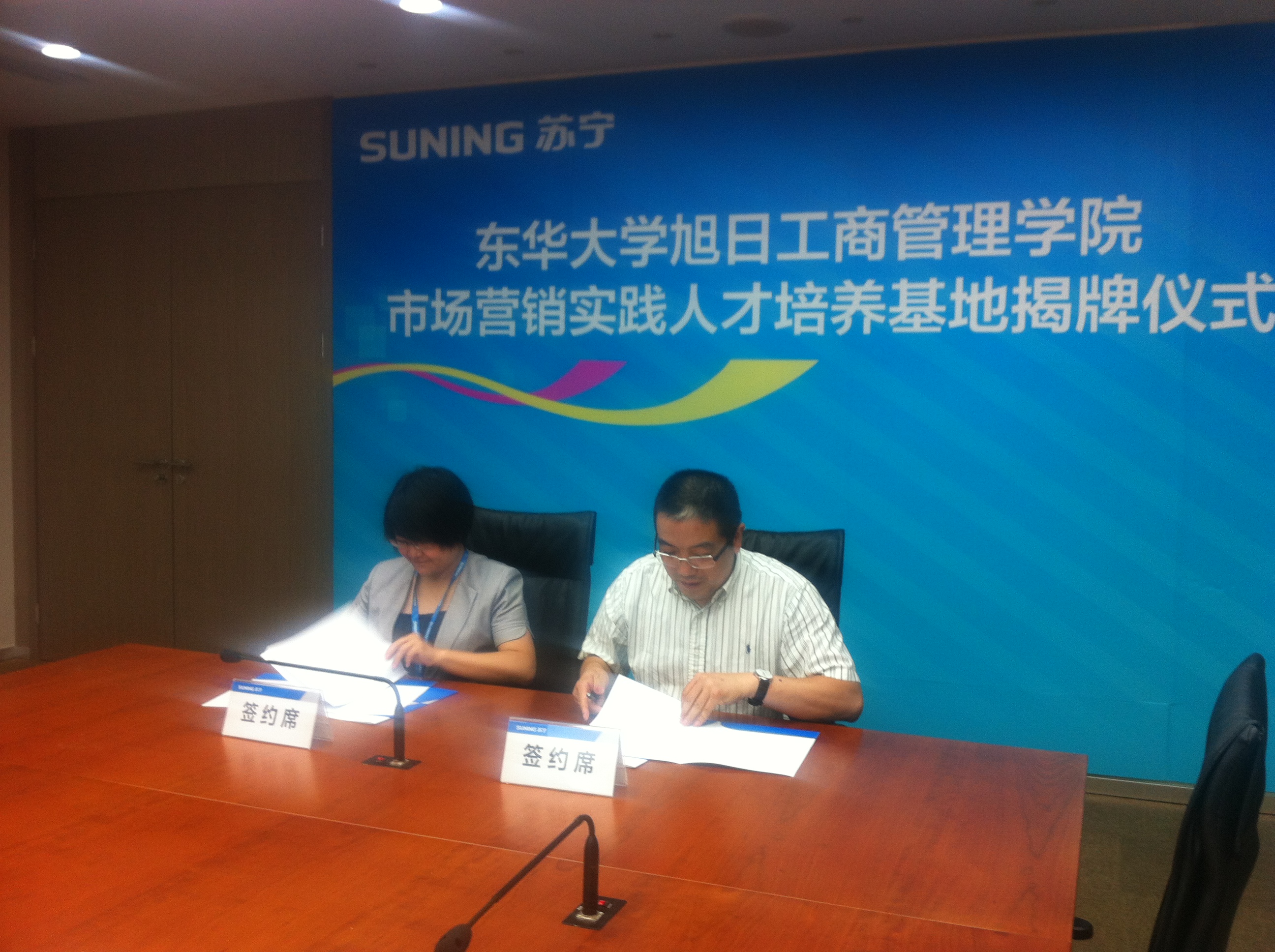 2013年7月17日,成人网址 市场营销实践人才培养基地签约挂牌仪式在苏宁云商集团上海地区管理中心举行。成人网址 副院长张科静、工商管理系主任刘东胜、副主任杨志勇、学生工作办公室江娥、高加加参加签约仪式,苏宁云商上海地区管理中心副总经理王鲲、人力资源总监王志英、人力资源部招聘经理周玲出席仪式。