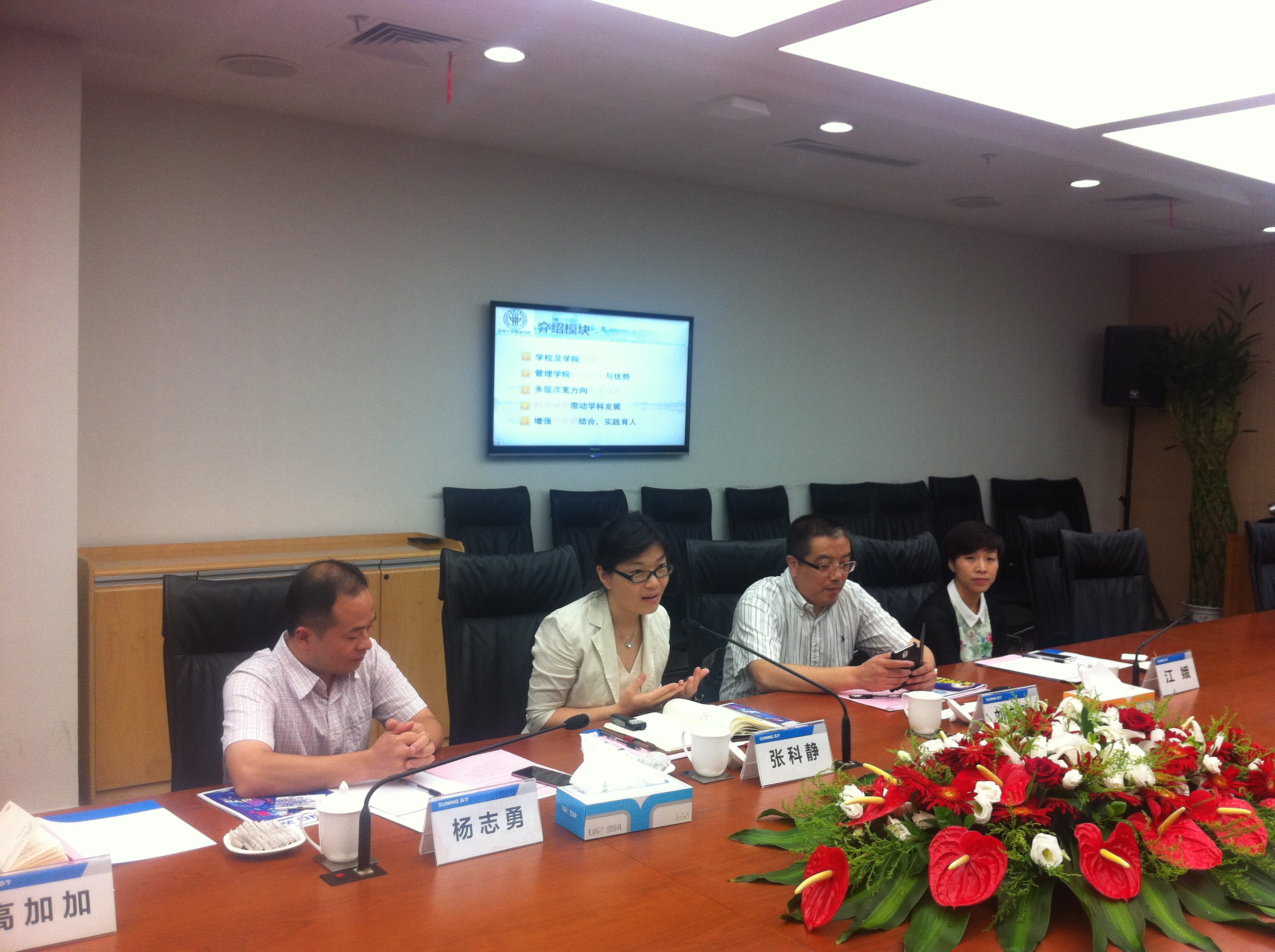 仪式开始前,双方互相交换了名片并简单进行了介绍。仪式开始,首先苏宁宁云商的王志英经理介绍了苏宁云商概况、“1200工程”以及与东华校企合作的内容:苏宁云商现在已经形成初步零售、房地产、酒店、投资等协调发展的新格局; “1200工程”是针对应届毕业生的人才培养系统,迄今已经开展了十三期,为苏宁培养了大批的中高层管理人才;与成人网址 的合作经过前期充分的酝酿沟通,将从市场营销实践人才培养基地和苏宁校园菁英俱乐部两个方面开展深入合作。接着,刘东胜老师介绍了学院工商管理系的学科特色及学生特点:工商管理系共有15名专业教师、包括市场营销和工商管理两个专业、学科培养覆盖本、硕、博等、学科建设排名位于全国前列等。此外,刘老师表示希望可以与苏宁开展科研、竞赛等多层次的深入合作。随后,苏宁云商上海地区王鲲副总经理讲话,对即将与东华开展的校企合作表示欢迎,接着深入介绍了苏宁的发展及改革历程、“阳光苏宁”理念以及苏宁培养员工企业责任感的举措,也希望与成人网址 加深科研、人才培养的合作;成人网址 张院长最后发表讲话,首先,张院长对这次校区合作的开展表示认同,希望首先实现从教学、培训、实习、就业等环节与企业无缝对接,从而与企业开展科研、案例等方面的合作,随后张院长通过PPT详尽的介绍了成人网址 成人网址 的发展历史、科研能力、人才培养特色、产学研合作以及国际化合作情况。