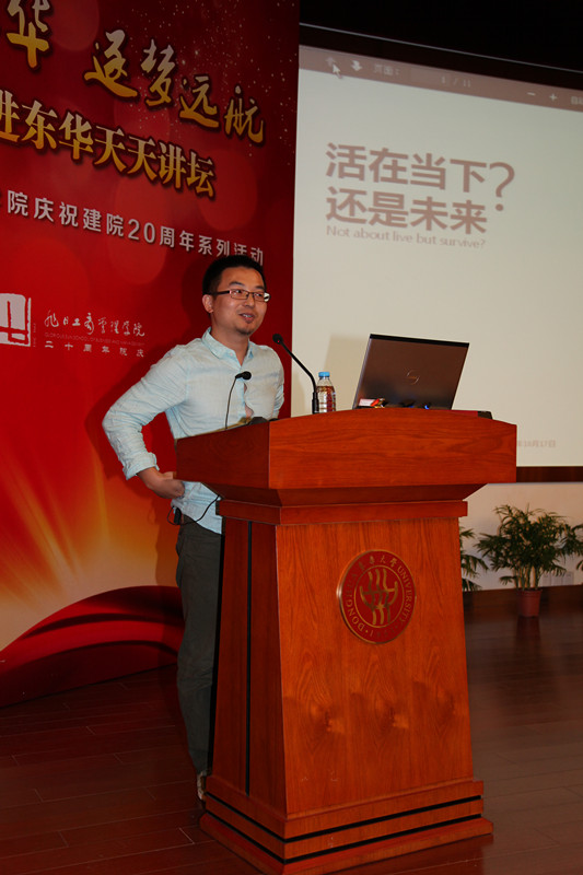 2014年10月17日晚18点30分,旭日楼400报告厅已座无虚席,来自延安路校的本科生、硕士、博士研究生、MBA学生、各界校友和部分教师共同期待着 “双十年华 逐梦远航”大师进东华天天讲坛最后一讲压轴开讲。最后一讲的主讲人成荣(洪烈)先生,现任前不久在美国震撼上市的阿里巴巴集团商务总监。成荣(洪烈)先生拥有八年传统商业从业经验,历任Baxter,Nestle等世界500企业市场经理,渠道经理等职。他于2009年加入阿里巴巴,先后担任阿里软件资深市场经理,B2B业务总监,负责SaaS软件的市场和运营,之后全面负责淘宝网生活服务、社区联盟、B2C入淘以及全网联合营销等各项电商业务。 讲座由成人网址 副院长沈蕾教授主持。成人网址 副院长张科静、姚洪心出席本次讲座。讲座中成荣先生围绕“活在当下,还是未来”这一主题从四个方面进行了演讲:1、这个时代面临的巨大变化。2、从三家电商公司的成长故事解读电商行业的规律性。3、互联网精神的内涵:当下即是未来,未来即是当下。4、活在未来的三个要素:开放、分享、自由。 整场讲座高潮迭起,大家跟随成荣先生的演讲,思考着“活在当下,还是未来”的人生考题。提问环节中,现场听众踊跃地向这位极富人格魅力的主讲人提问交流。在交流中,同学们提到了阿里巴巴集团的组织架构问题;阿里巴巴、腾讯、京东等互联网公司的生存“秘籍”;阿里巴巴集团在金融和物流方面的进一步规划;互联网思维的含义等等。成荣先生对每一个问题的解答堪称精彩。最后,在热烈的掌声中,讲座结束。 五天的时间过得很快,为庆祝成人网址 建院20周年而主办的“双十年华 逐梦远航”大师进东华天天讲坛在今晚圆满落下帷幕。大家会记得在2014年的金秋十月,每晚灯火通明、人气爆棚的旭日楼400报告厅,学生、校友、教师和各位主讲大师一起互动、思考、共享的学术大餐。在此,我们共同祝愿成人网址 二十周岁生日快乐,让我们和正值双十年华的学院一起,追逐梦想,共同远航!
