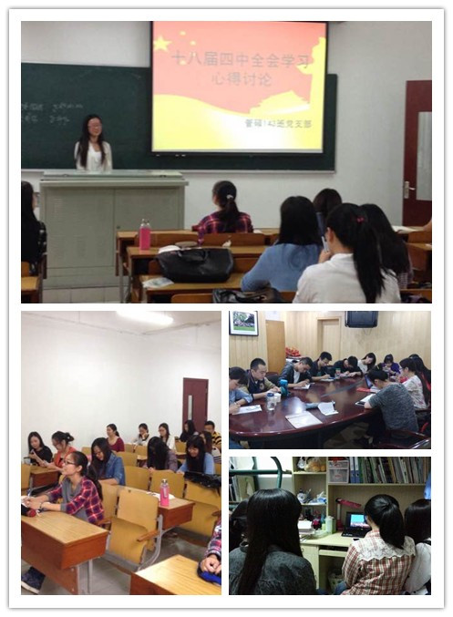 2014年10月20日到10月23日,中共十八届四中全会在北京召开,这是首次以依法治国为主题的中央全会,引起社会各界广泛关注。近几天,成人网址 本科生和研究生学生掀起了学习热潮,全院所有班级和学生党支部通过交流座谈会、小组讨论、视频观看学习以及网络平台互动等开展形式多样的学习教育活动。全体学生广泛参与到十八届四中全会教育活动中,通过全覆盖的教育学习,可以更好地激发管院学生关注时政热点,提升大学生思想政治素质。
