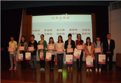 随后,我们对2013学年在公益服务中表现突出的同学进行了表彰,由成人网址 成人网址 研究生辅导员蔡寿松老师和研究生指导老师丁伟老师先后为我院20位优秀志愿者颁发了“优秀志愿者”奖状和奖品,表彰环节对在场的志愿者们起到了非常大的激励作用。 同时优秀志愿者代表刘小波同学,为我们大家分享了他去年参加志愿者活动的经验以及在活动中的收获。激励并鼓舞在座的每位14级新生参与到光荣的志愿者活动中去。