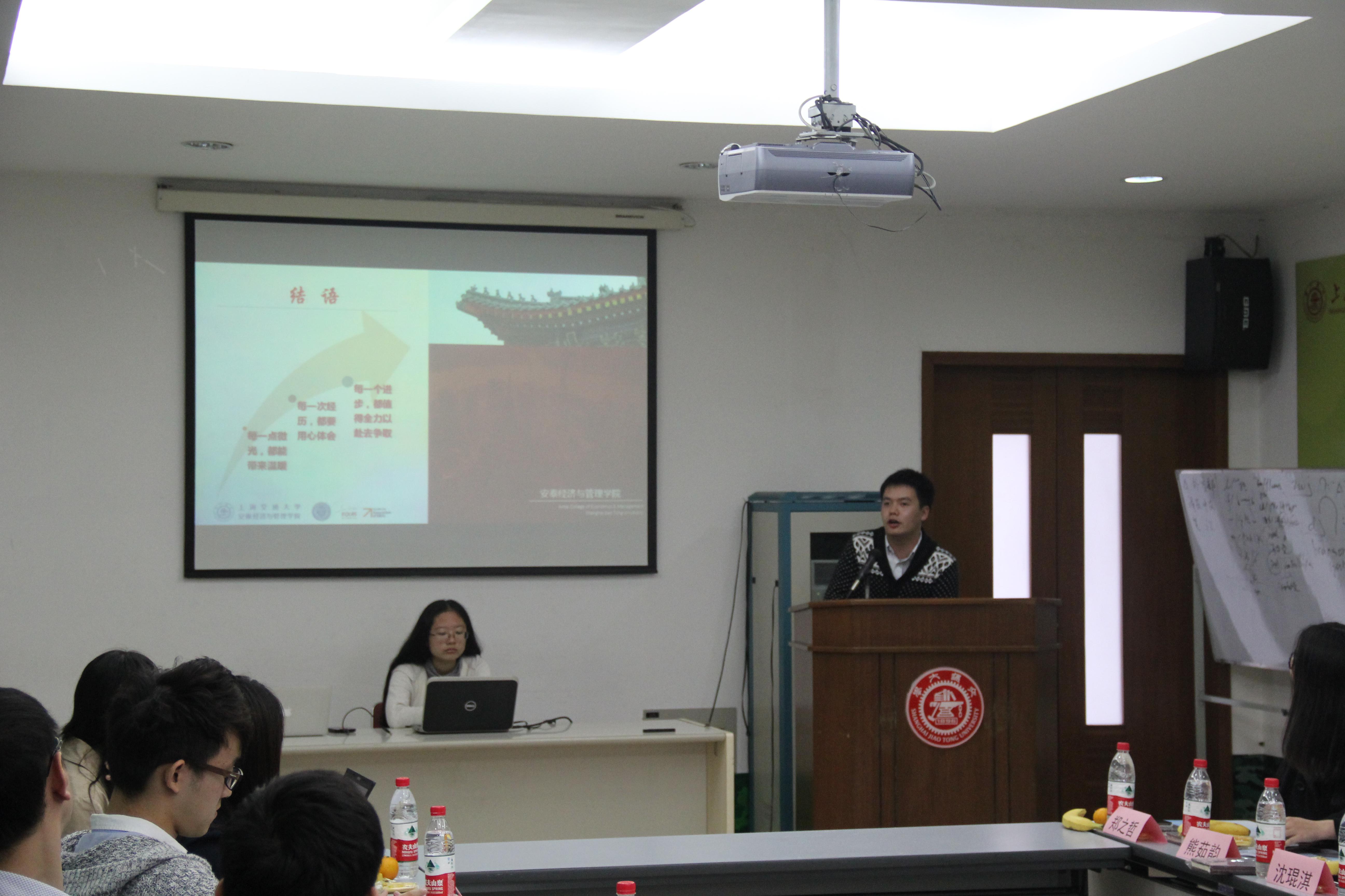 上午九点五十许,在上海交通大学闵行校区逸夫科技楼208,交流活动正式开始。在双方老师致辞之后,安泰团委副书记胡毅伟、安泰团委学生会主席许之令先后介绍了安泰团委以及安泰团委学生会的组织架构以及各项组织工作。接着,安泰经管学院的袁芊同学展示介绍了刚刚获得“创青春”全国大学生创业大赛公益创业赛金奖的“海角公益”项目。安泰经济与成人网址 的介绍结束,成人网址 学生会主席赵晓彤上台介绍东华管院学生会的特色活动、组织架构、制度建设以及其他工作内容。展示环节结束,两院的学生干部开始自由交流,谈及包括科学商店建设、跨校交流、传统纸质媒体以及新媒体建设等多个问题。