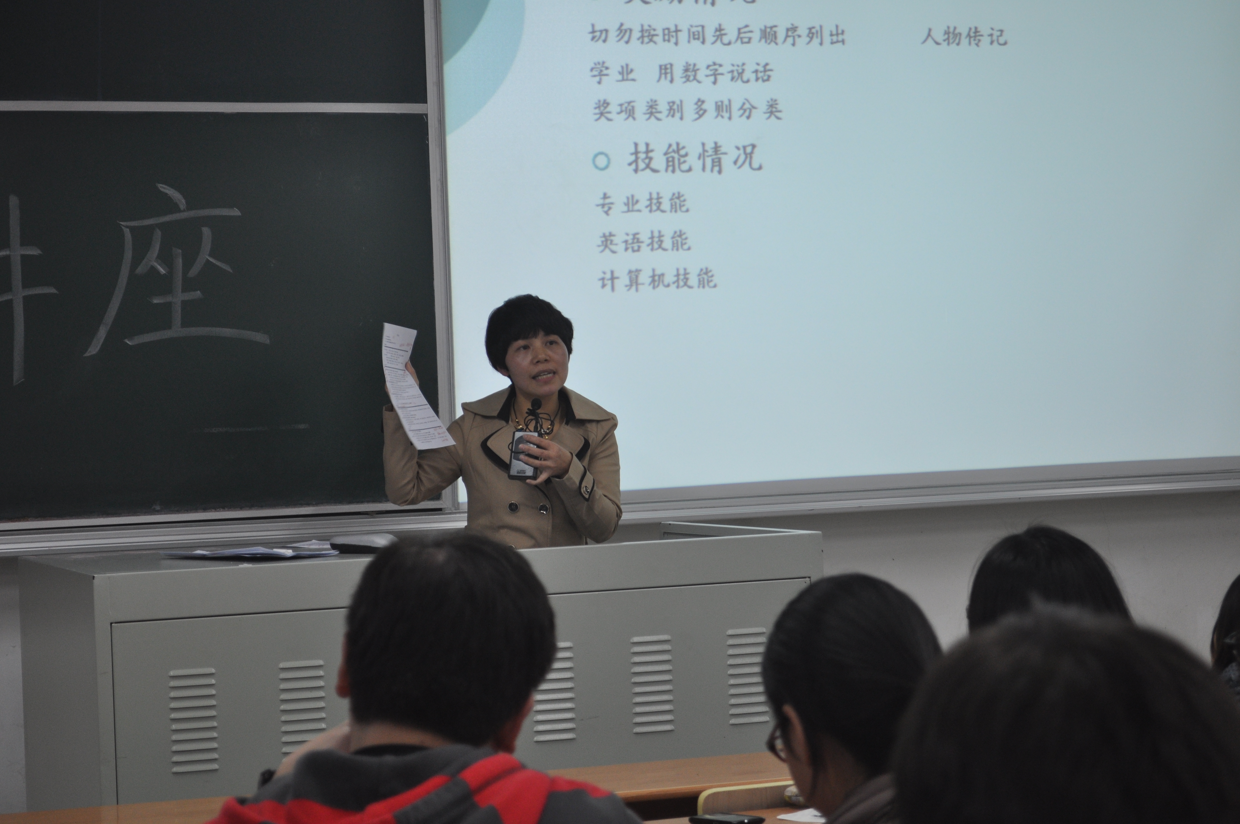 2014年11月19日18:30成人网址 研究生会举办的职场系列讲座在四教110举行。讲座邀请了彩虹人生工作室福怎、多年主管就业工作的王丽华老师,就应该如何根据应聘岗位做简历、如何应对面试等等问题进行了非常详细的讲解。 整场讲座爆满,时不时爆发出的笑声以及王老师激情富有感染的讲述声吸引了四教其他教室的很多同学。 讲座开场后,王老师以作为苏宁云商招聘的面试官的切身经历作为开场,指出在求职过程中没有经验的应届生在应聘时出现的一些问题,并引出本次讲座的主题,如何通过简历和面试更好地展示自己。