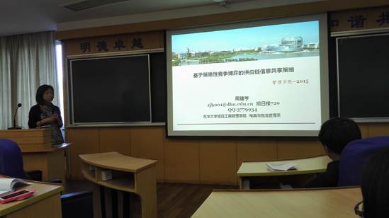 5月5日下午2:30,我院第三期青年教师优秀学术成果交流会在旭日楼306如期举行。主讲人为周建亨和王志宏副教授,交流会由姚洪心副院长主持。周建亨老师的学术交流以“基于策略性竞争博弈的供应链信息共享策略”为主题,王志宏老师以“商业信用和收入共享组合合同下集成服务提供商与其客户间的协调”为主题。我院张科静、刘峰涛、马彪、曹海生、王晓锋、王长军、贾永基、沈滨、李庆颖等老师和众多研究生参加了此次讲座。 周建亨老师首先从供应链经典研究方向谈起,并且交流了自己感兴趣的研究方向。接着交流了供应链的基本结构,包括单一供应链、双渠道供应链和供应商、全面竞争几部分。最后谈到了研究背景--供应链信息共享,包括分离均衡、混同均衡以及信息共享下的模式选择几方面。