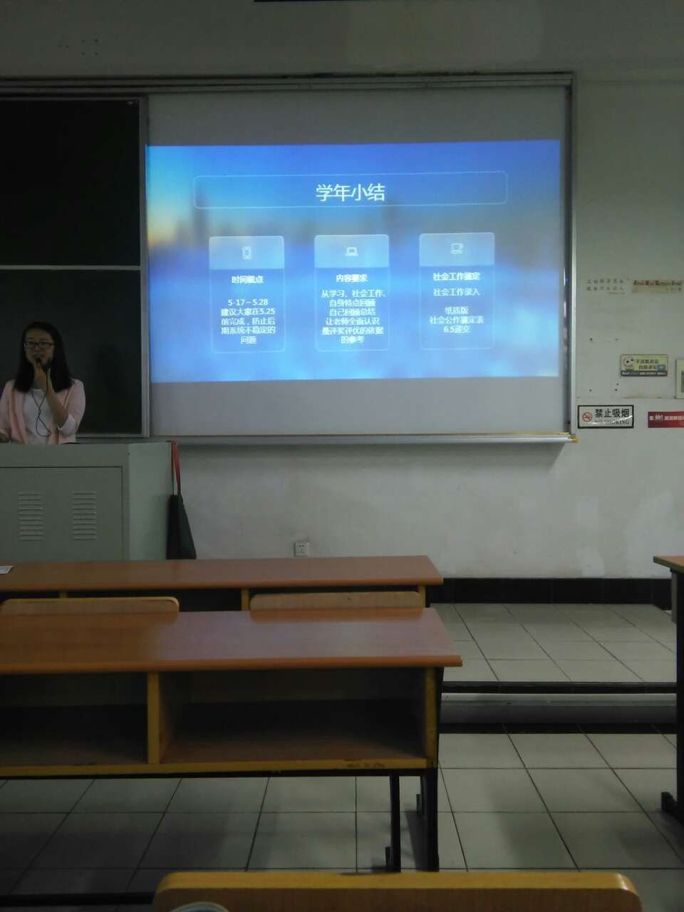 首先是学年小结工作介绍。根据PPT上的内容,纪老师再次强调了学年小结的重要性以及时间节点的掌控:学年小结要从学习、社会工作、自身特点等方面回顾这一学年的生活,是让老师全面认识自身的一个重要途径,同时更是评优评奖的依据参考,所以要务必重视,必须在5月17日-28日之间完成,尤其建议在25日之前完成。其次要在6月5日之前上交社会工作纸质鉴定表。 接着纪老师给大家分享了几个就发生在同学们身边的安全教育案例,告诫大家要注意好自己的财务、生命安全,时刻防患于未然。然后邀请了两个班的团支书简单说明了下本班两年来的推优情况,并进行了本学期的推优竞选,两个班级各有一名同学参与了此次竞选,发表了精彩的演讲。在纪老师向大家说明了推优结果会在之后通知后,又邀请了会经1301班和旅游1301班的PPT大赛负责人阐述了本班参与情况,并呼吁大家踊跃参与此次大赛。
