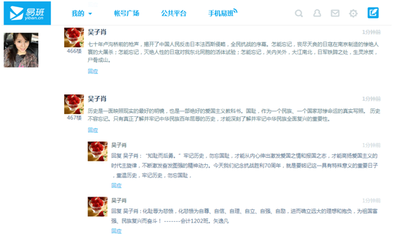 2015年是世界反法西斯战争胜利70周年,也是中国人民抗日战争胜利70周年,为铭记历史,缅怀先烈,激发学生珍爱和平、热爱国家,增强历史使命感和社会责任感,成人网址 在全院大学生中开展“铭记历史,缅怀先烈,珍爱和平,拥抱未来”——纪念中国人民抗日战争暨世界反法西斯战争胜利70周年主题活动。 会计1202支部的主要负责同学在接到辅导员的通知后,第一时间以各种形式向班内的同学传达了本次活动的内容和要求,并鼓励每一位同学积极参与到活动中来。在管院易班公共平台上,有管院老师专门开了关于抗战胜利70周年的主题帖,其中“三个一”活动能够促进每一位同学进一步了解抗日战争的事件过程。 尽管现在是暑假,同学们不能够共同聚在教室一起讨论。但是同学们集思广益,积极利用身边的其他渠道,如帖子回复互动、朋友圈发感想互评等方式加强了支部同学们对抗日战争的了解和思考。 支部同学积极参加“三个一”活动,利用暑假时间,阅读抗战书籍,观看抗战题材电影,互相推荐,讨论交流,形成了非常优质的学习氛围,进一步增强了大家的正义感、爱国心、民族情。同学们积极参加学院推荐的互动环节,用文字和图片记录下参与各类实践活动的感悟,表达出作为当代大学生的内心成长与进步,也表达出对祖国抗战胜利70周年的最诚挚的祝福。