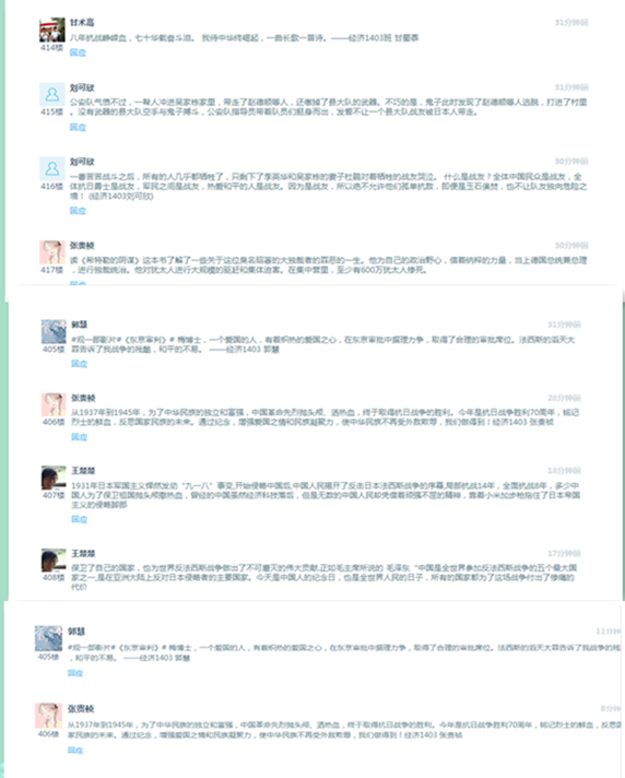 无论是党员、入党积极分子还是普通学生都积极融入到活动当中,在心灵深处缅怀先烈,感受和平来之不易。其中经济1403班团支部,班委积极组织大家参与到活动中,以实际行动来缅怀先烈。通过这次跟帖活动,经济1403班支部学生,不仅对这段历史有了深刻的认识,也对先烈们不怕牺牲的精神有了深刻感受。同时坚定了维护国家主权的意识,坚定了维护世界和平的立场,从历史的教训中感受到和平来之不易,同学们纷纷表示在以后的学习生活中要继承发扬革命先烈的精神和斗志,为建设社会主义事业而奋斗。