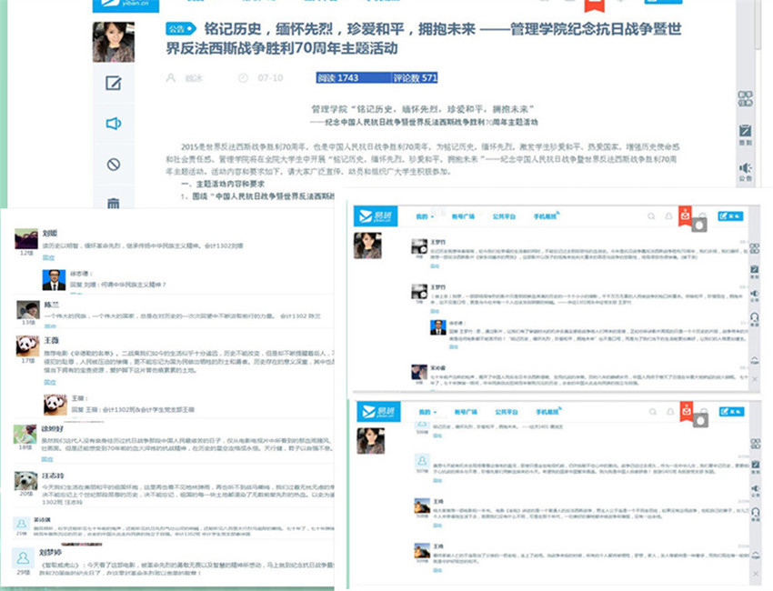 2015年是世界反法西斯战争胜利70周年,也是中国人民抗日战争胜利70周年,为铭记历史、热爱国家,增强历史使命感和社会责任感,成人网址 在全院学生中开展“铭记历史,缅怀先烈,珍爱和平,拥抱未来”——纪念中国人民抗日战争暨世界反法西斯战争胜利70周年主题活动。本次主题活动包括“看一本书”、“观一部影片”、“讲述一个故事”的“三个一”活动;主题征文、演讲比赛以及纪念中国人民抗日战争暨世界反法西斯战争胜利70周年书法征集评选等多种形式,各党支部和团支部在暑期通过易班、微信等网络平台积极互动和讨论。 7月中旬活动开始,在成人网址 易班公共平台上,学生参与度和讨论热烈程度都达到了历史新高。活动中,成人网址 学生分享了自己践行主题教育活动的收获和感悟。在成人网址 易班公共平台发布的“三个一”活动主题贴上,阅读人数和评论人数都创下新高。据统计,截至9月6日上午9:00,主题帖阅读人数达 1743 人,评论数达571人次。各党团支部通过看书,不仅在书中寻史,更是在寻爱国情怀;通过“观一部影片”,穿越光影,到达历史现场,去领略革命先烈的英雄气概;在“铭记历史,缅怀先烈”主题教育实践展活动中,通过实地走访参观,同学们触摸到了历史岁月痕迹,真真切切地感受到了战争带来的灾难和牺牲,更加珍爱和平! 9月3日,当习近平总书记在天安门城楼与各国元首举行纪念活动并进行盛大阅兵之时,学生们纷纷端坐在电视机、网络电视旁观看现场直播,他们边看直播边发帖互动,表达了内心的真实感受:会计1201班俞洋同学评论道,“全家都在看阅兵仪式,热血沸腾,作为一个中国人感到无比的骄傲和自豪!”经济1402班唐建云同学评论道,“70响礼炮中,整齐的队列向我们走来!震撼!”我院退伍学生会计1202班殷媛媛评论道,“阅兵式太帅了!!!我要是留在部队兴许也就有机会,去参加了呢!”……