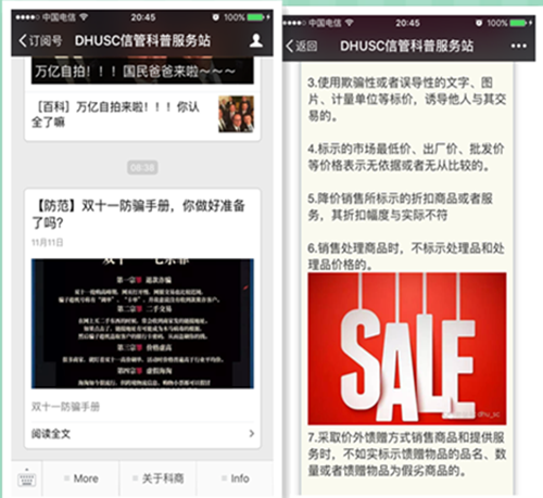 “双十一”当天,科学商店的微信平台“DHUSC信管科普服务站”也相应地发布了关于防诈骗的推送,推送内容详细讲述了当前黑心商家惯用的手段以及应对措施,使同学们在快乐网购的同时擦亮眼睛,避免不必要的经济损失。 保卫处姚建强老师表示:通过本次“双十一”防诈骗活动的宣传与开展,让更多的同学对于网购诈骗有了更充分的认识,提升了同学们的自我防范意识,为校园安全稳定做出努力。 (撰稿:夏磊、丁伟)