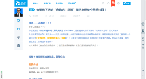 2015年10月21日-30日,由成人网址 易班中心举办的“奔跑吧,易班!”大型秋季户外趣味运动暨易班主题推广活动在成人网址 延安路校园成功举行。活动旨在加强学生体质锻炼的同时推广易班的相关应用,最终使易班在学生中得到普及。