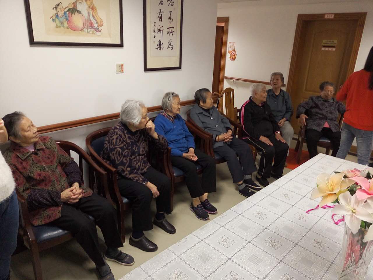 当来到老人们居住处时,已经有些许午睡之后的老人聚在一起聊天、看报、写书法。在看到志愿者们到来后,老人们在朱奶奶的安排下齐齐围坐着,观看志愿者们表演节目。虽然爷爷奶奶们爱听的老歌同学们大都不会唱,但是大家也竭尽所能演唱他们那个年代爱听的歌曲。刚开场,程帅、牛梦雅带来了动听的歌曲:《草原上升起不落的太阳》、《康定情歌》、和《我的祖国》等,嘹亮的歌声使老人们听得都乐开了怀,双手为他们点上大大的赞。表演节目的过程中,爷爷奶奶们也都情不自禁地哼着调儿,拍着手,加入了大家的演唱中。其中三位老人也热爱音乐,还组成了一个小合唱队,当爷爷奶奶们慷慨激昂地唱着《共筑中国梦》和《驼铃》时,她们仿佛又回到了保家卫国的时候,热血沸腾,飒飒英姿依然不减当年。