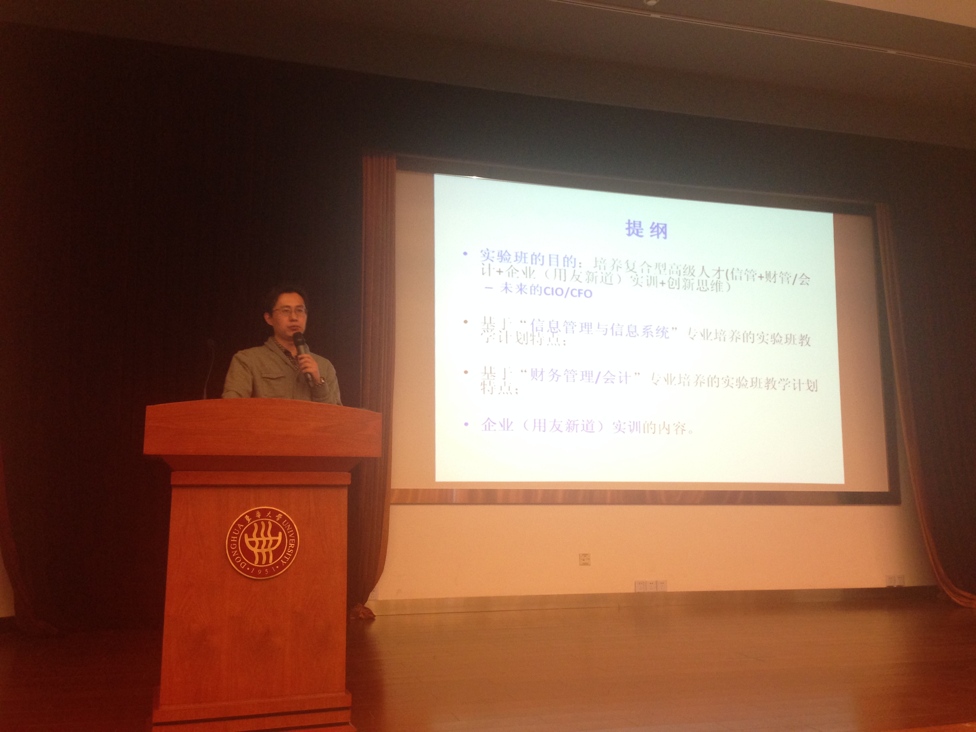 信管系主任为同学们详细地介绍了管理信息化实验班的教学计划。开设实验班的目的是要培养复合型高级人才(信管+财管/会计+企业(用友新道)实训+创新思维),面向新时代企业对于这种人才的大量需求,打造未来的CIO/CFO。老师分别从两大类专业培养的方面为我们介绍了实验班教学计划特点:分别是基于“信息管理与信息系统”、“财务管理/会计”,还有关于企业(用友新道)实训的内容。 这次实验班招收的学生人数是45人,老师希望大家都可以踊跃报名,一旦开始学习就要坚持把这套完整的知识体系学完。这将是一个三方合作教学的培训计划,企业(用友新道)教师、信管专业教师还有会计专业教师会一起参与到教学过程中,并将对同学们的学习实践表现进行考核。实训时间在日常学期周末(大约从第十一周周末开始),还有暑假的集训(社会实习结束后的一两周),总共560个学时。 同学们可以根据实验班对于自己专业的教学计划安排,选修教学大纲内的相关课程。因为横跨了两种专业,所以同学们在实验班中还将学习很多补充课程,这些课程的学分是免费的,而且在课程结束之后可以通过向教务处申请的方式,抵充6个学分的专业选修课。参加管理信息化实验班需要同学们有提高自身综合能力的意愿,并且愿意在课下投入很多的时间和精力,能够踏踏实实坚持完成所有的课程。目前信息化水平越来越高,企业对于员工的要求已经不仅仅局限于理解会计的借贷或者停留在手工记账上,更多地需要员工可以运用信息化软件实现管理层面的工作。 张丹老师为同学们介绍了用友公司,目前有很多企业的会计软件都是由用友公司开发维护的,所以用友的认可雇主非常多。用友与成人网址 的合作也有很长时间了。在实验班课程结束之后,表现优秀的同学可以获得用友的能力认证,这也为同学们日后顺利进入企业、会计师事务所工作打下了不错的基础。