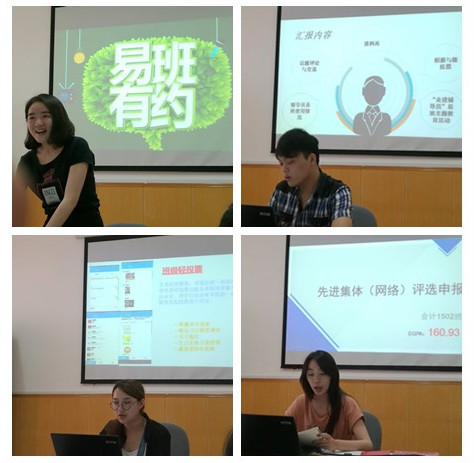 经自主申报,全院有14个班级提交申请材料,学院易班发展中心认真审核材料后,最终通知13个班级参加答辩。中午12:25答辩会准时开始,首先由旅游1501班班长刘飞同学代表该班答辩,他通过在易班班级开展线上团日活动,注重在特殊节日发布话题帖,吸引同学浏览和回复等方面阐述了该班易班工作的开展情况。其后会计1401班的吴凡同学代表该班答辩,其流利的答辩演示,到位的总结和丰富多彩的易班活动也赢得了现场的好评。营销1402班的刘静静同学,采用访谈的方式进行答辩,形式新颖,答辩幽默,将易班班级的定位为“有用、有趣、有回忆”线上社区,采取多种方法鼓励学生参与易班班级的建设,从而打造出了多元互动、文明有序、记录青春等易班班级。其后经济1504班、会计1402班、管科1501班等班级先后进行了答辩。其中会计1502班,通过班委动员,全班同学积极创建先进网络集体,将主题团日活动、线上线下班会、通知推送、热门话题发布、经典语录、校园随拍等全部在易班班级中进行,使得班级EGPA值(即班级活跃值)达到了160.96的最高值,成为全院EGPA值最高的班级。会计1501班在答辩中提到了除了学期中开展各种易班线上活动,在寒假春节期间考虑到同学分散的特点,顺势开展了在“晒年夜饭”的易班线上活动,将浓浓的年味和各地的习俗传递给每一个同学,凝聚了班级,增强了同学的集体感,其易班班级EGPA值达131.75。财务1501班则抓住易班线上投票等关键地,通过发动同学拉票等方式,推广易班的使用,收到了很好的效果。