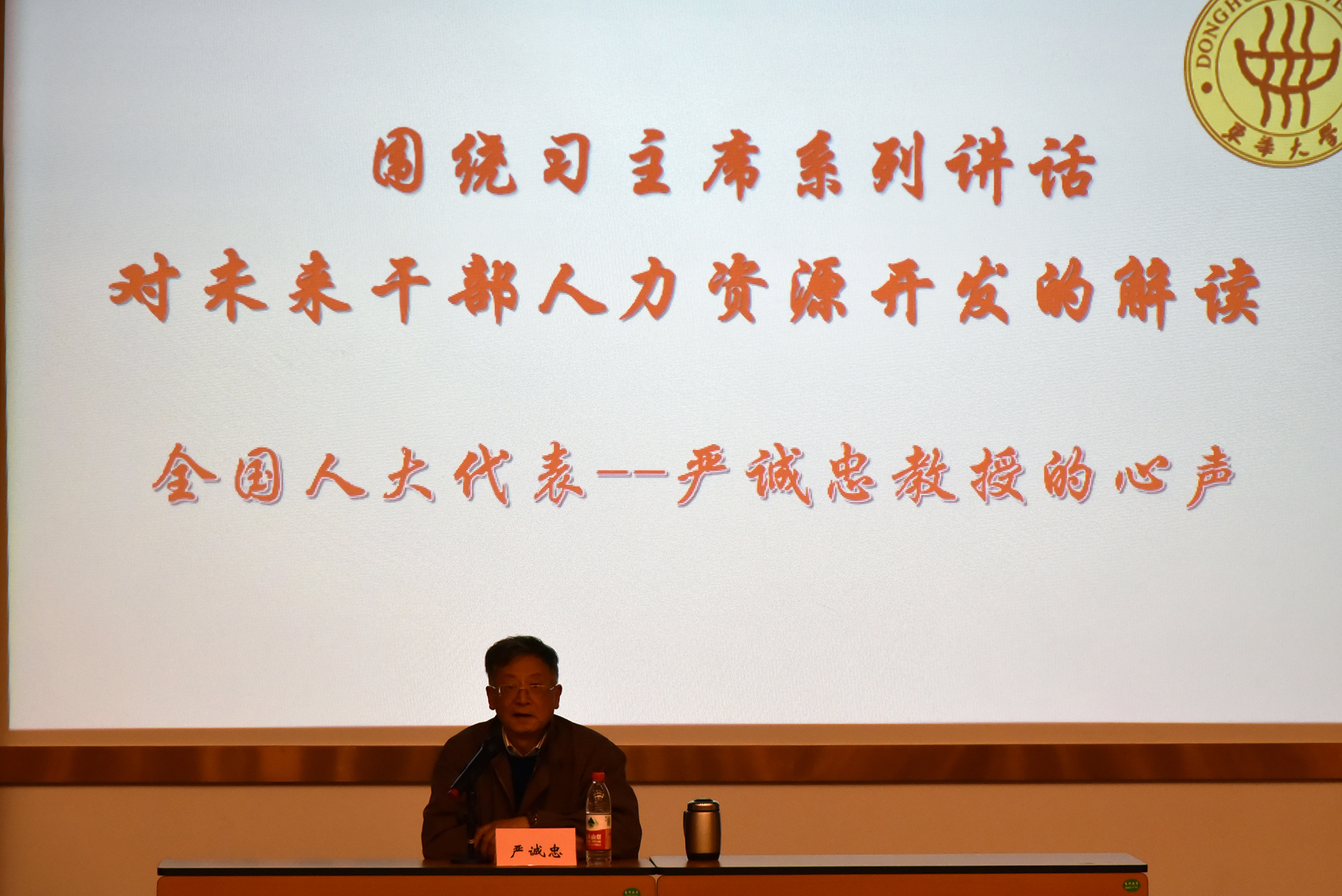活动进入正题,严老师围绕着习主席系列讲话,结合了自身经验,为大家解读了未来干部人力资源开发这一话题。严老师提出当代大学生作为国家建设的后备军,对自身的修炼要注重四点,第一是知识,这里的知识是一个动词,指的是知道多的同时要认识深刻;第二是观察,要见微知著;第三是思考,面对当今国际局势要有自己的见解;第四是提炼,懂得对汲取到的知识进行归纳总结。 讲座上,严诚忠教授还从一个党外人士的角度,对党员干部的修养与培养发表了自己的解读,对在座的学生党员提出了殷切的希望与告诫。他指出:一个人尤其在参与了党组织之后,作为执政党的成员,他的修养决定了其所在执政党的形象,也决定了该执政党的执政效果,他的所作所为不该违背老百姓对其的拥护支持。因此,共产党干部的修养应该更加提高。那么怎么来提升干部的个人修养呢?严诚忠教授又指出,首先就要提高其自身的素质。素质,即指一个人驾驭人生和享受生活的能力。联合国教科文组织主张,教育的本质应该在四个方面:学会做人、学会做事、学会与人共处、学会与人共赢。因此,严诚忠教授深刻地认识到,在这一点上,共产党面临新的机遇和挑战,对共产党干部的要求也越来越高。在2014年底进行全国人大代表培训时,党中央便强调在三个全面基础上所增补的第四个全面——“全面从严治党”。这便是为什么反腐败不是打一阵子老虎便松懈。反腐败、惩治腐败,立足改进,始终是保持着一种进步性。因此在本届党中央领导下,大家都更加重视共产党的干部建设,反对以权谋私。严诚忠教授表示,学生党员以后都有可能成为共产党的重要干部,他作为一个党外人士,衷心的希望在座的各位可以注重提升自己、提升自己的修养。