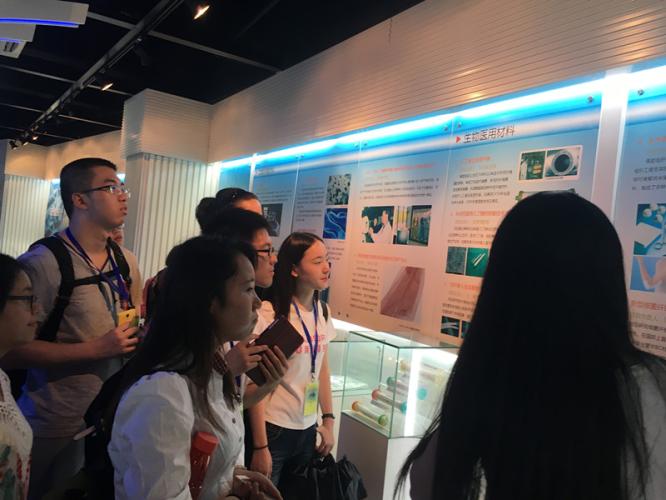 发展历史、发展过程中经历的重要事件与学校开办至今取得的荣誉,同学们跟随志愿者的介绍缓缓前进,眼神里充满好奇与敬佩。科技馆的志愿者也向依次向同学们展示了陈列厅里的物品,如各种功能纺织纤维制成的服饰、军用防弹材料、玉米制成的貔貅等。同学们对于科技馆内的产品产生浓厚的兴趣,在志愿者讲解结束之后,还对几样展品提出自己的疑问。