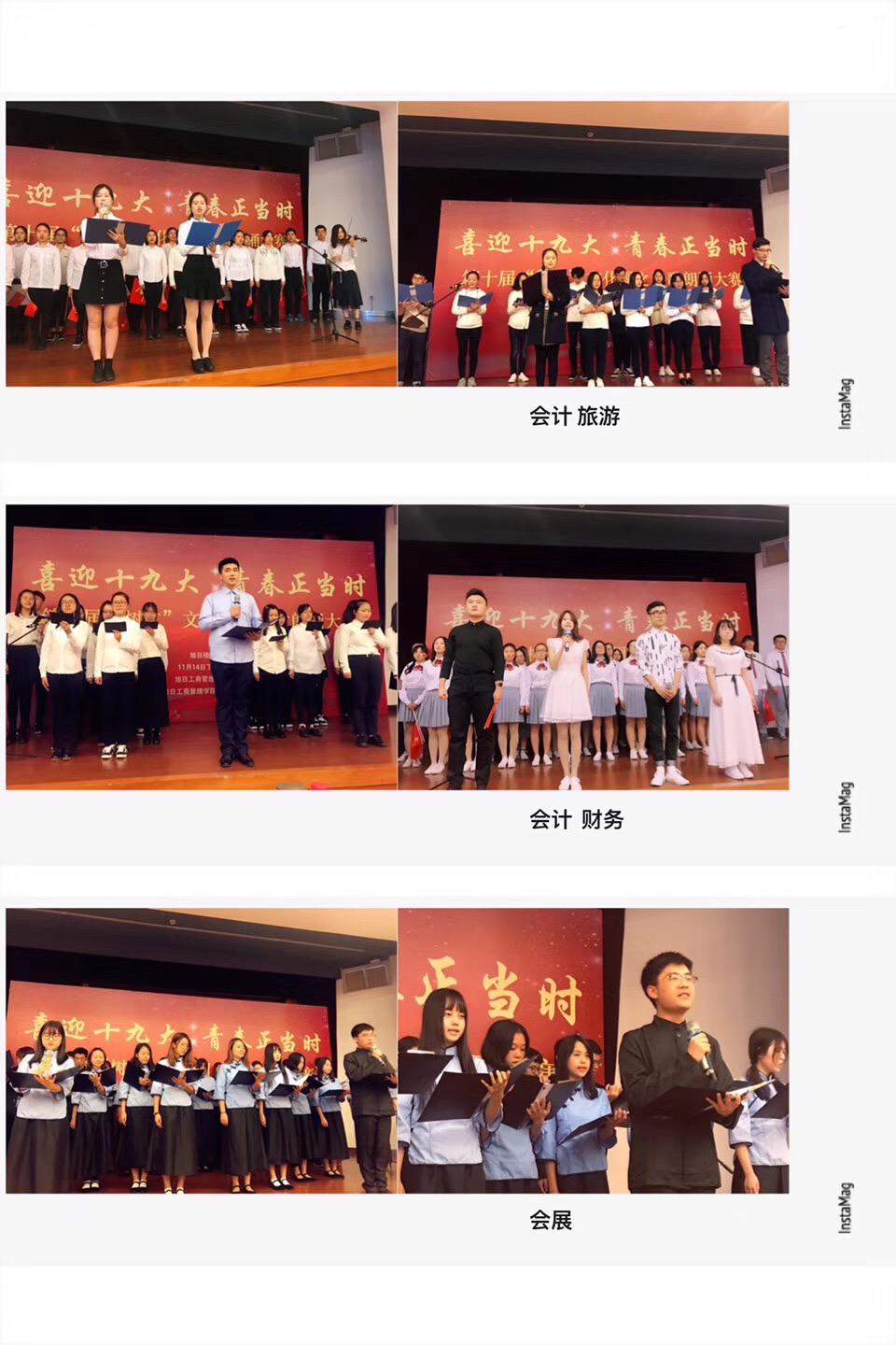 此次诗歌朗诵以“喜迎十九大•青春正当时”为主题,各团支部在诗歌朗诵中融入舞蹈、乐器、汉服、武术等中华传统文化元素,一展各支部的飒爽风采。诗歌朗诵主题均围绕中国梦、十九大等内容进行。营销1601团支部《喜迎十九大,思考与回答》突出全体同学在党的指引下,不忘初心、砥砺前行,青春的道路充满动力与生机的愿景;信管1601团支部《少年中国说》,声音振聋发聩,星火燎原十九大,新时代里换新天,激励着少年们砥砺前行;会经1601团支部则以五年为期,将其心声献给伟大的党,抒怀青春前行,点燃青春的焰,将十九大精神融入日常生活,迎难而上,到达理想巅峰;工商1601团支部以诗歌为经,以青春为纬,以东华为案,织就衣物,也织就天地,展开中华的辉煌画卷;人民有信仰,民族有希望,国家有力量,正如正确的人生信仰是一根脊梁,支撑着人生的大厦,商务1601团支部吟诵的《信仰》给予我们振奋人心的力量,让人拥有宽广的胸怀。一声声铿锵有力的声音环绕在报告厅内,展现如初升太阳般朝气蓬勃的精神,抒发了同学们对东华的热爱,表达了同学们坚定跟党走的信念。岁月虽无语,但青春仍有言。