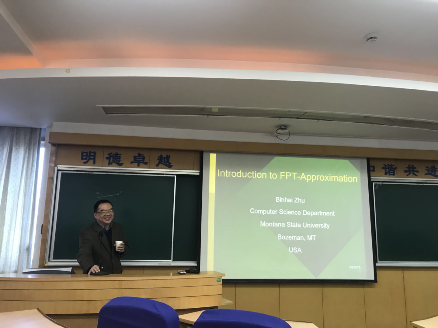 3月9日下午2点,美国蒙大拿州立大学朱滨海教授为成人网址 全体师生做了一场题为“参数近似算法简介”的学术报告,报告会在旭日楼306教室举行,由郑斐峰副院长主持。