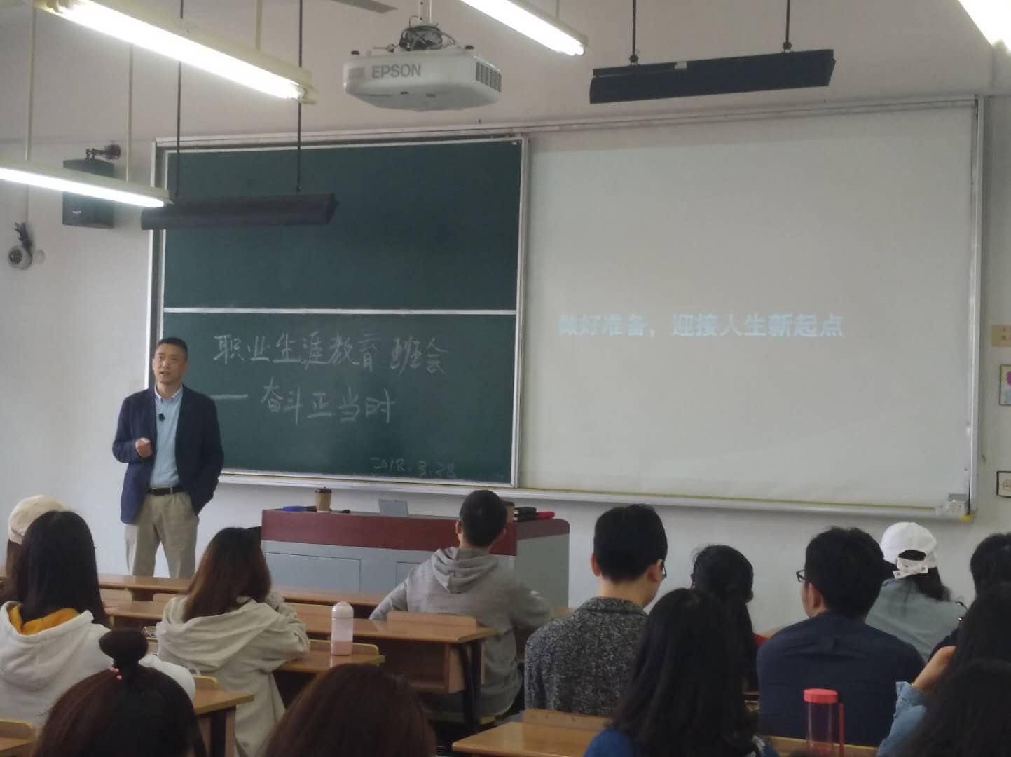 2018年3月28日,会计系“职业生涯教育”主题班会在四教105教室开展。此次班会面向会计学专业、财务管理专业共四个班级的同学,由辅导员徐志德老师对各班上一学年的学习情况进行总结,中国电信上海公司人力资源部骆巍先生为同学们做出专业培养及职业规划方面的指导。 徐志德老师首先对各班同学在上一学期的成绩情况进行总体的点评与分析,并鼓励同学们在大三的最后阶段再接再厉。