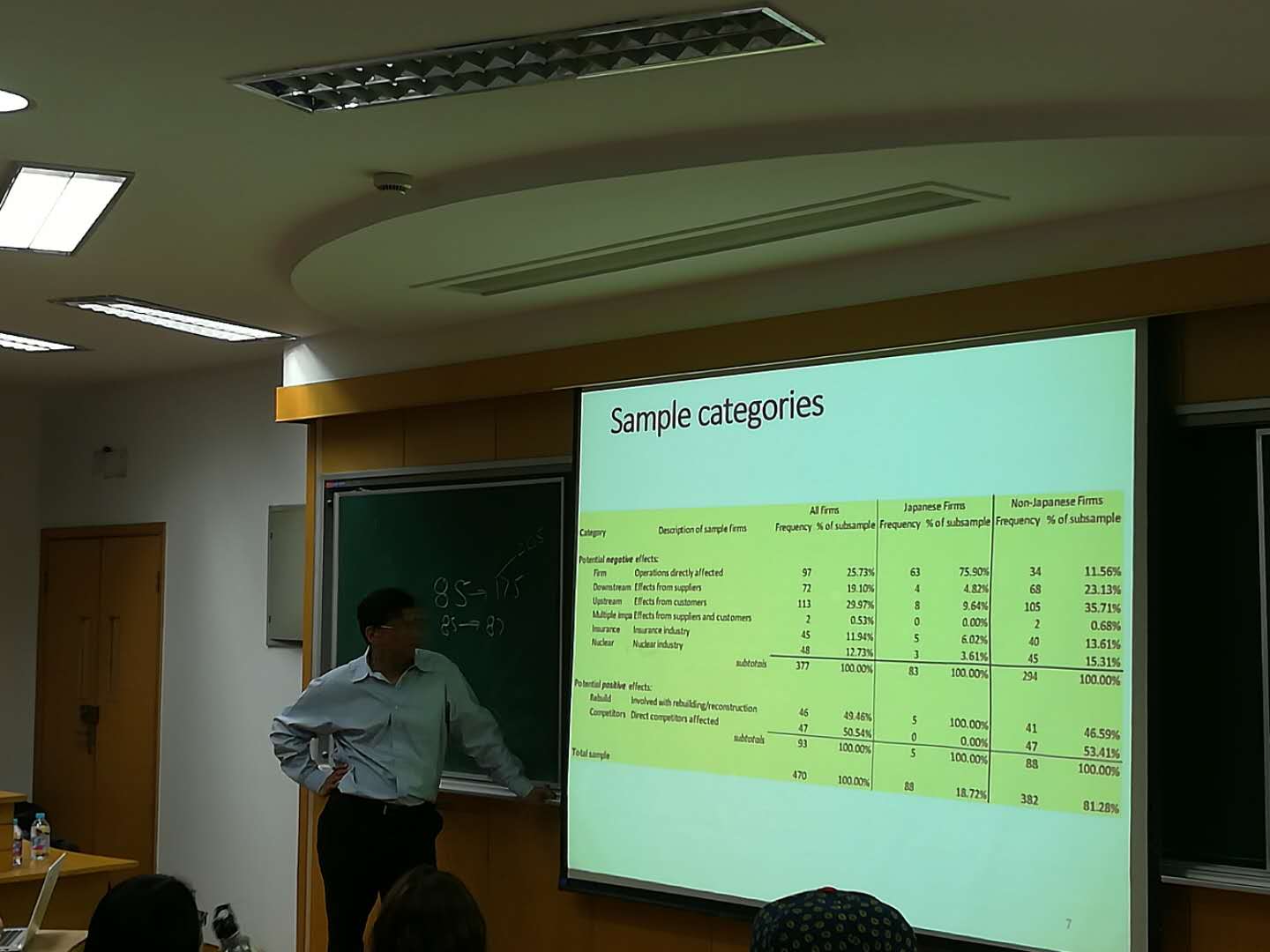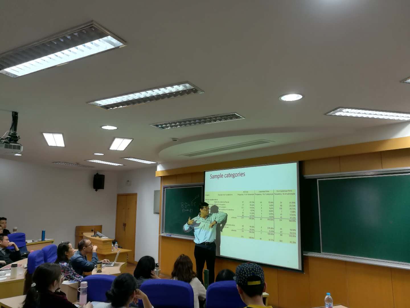 Vinod Singhal教授介绍了日本2011年的大东日本大地震(GEJE)背景下对全球供应链的破坏的研究,阐述了他的如何取样并分析全球470家上市公司的股价的研究方法,进而识别受影响的公司,并通过多个图表展示了他的研究发现。在场的同学们表现出强烈的兴趣,积极与Vinod Singhal教授进行了交流。