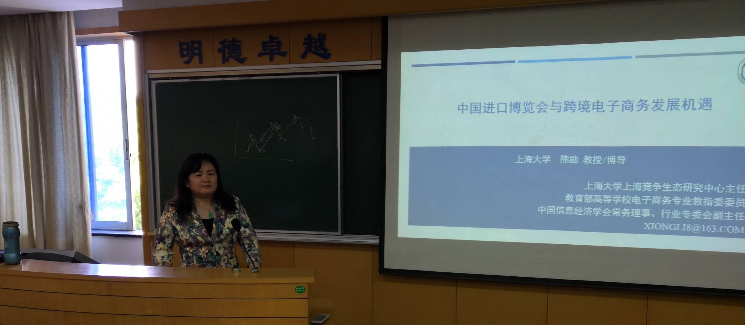 励教授介绍了互联网技术对国际贸易发展的促进作用,运用大量的数据,分析了中国跨境电子商务的发展状况,以及上海跨境电子商务发展的制约和限制。介绍了上海市政府通过中国国际进口博览会的举办,促进上海跨境电商的发展的策略。运用实际国际贸易和跨境电子商务的案例分析,对比了线下实体商务和线上电子商务的发展和促进关系。熊励教授的此次讲座给师生们留下了深刻的印象,引发了师生们对跨境电子商务发展策略的热烈讨论,激起了学生们的强烈兴趣。
