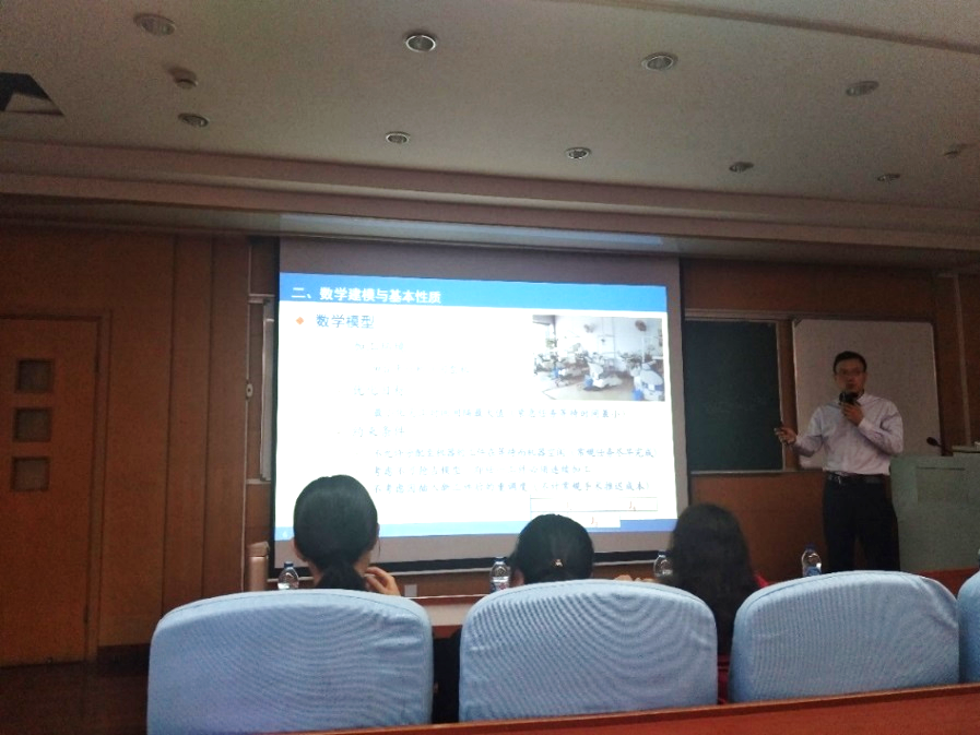 最后郑斐峰老师分享了关于“考虑完工时间间隔最小的平行机调度研究”的感悟,郑老师通过建立数学模型,作了关于考虑完工时间最大间隔最小的平行机调度的研究。