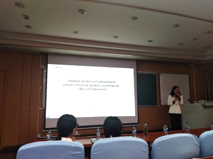 接着徐琪老师分享了以“Optimal pricing and replenishment policies of fashion apparel considering the effect of fashion level”为主题的报告。徐老师通过Pontryagin最大化原理考虑服装需求水平对服装动态定价策略和补货周期的影响来研究服装的动态定价策略和补货周期问题。